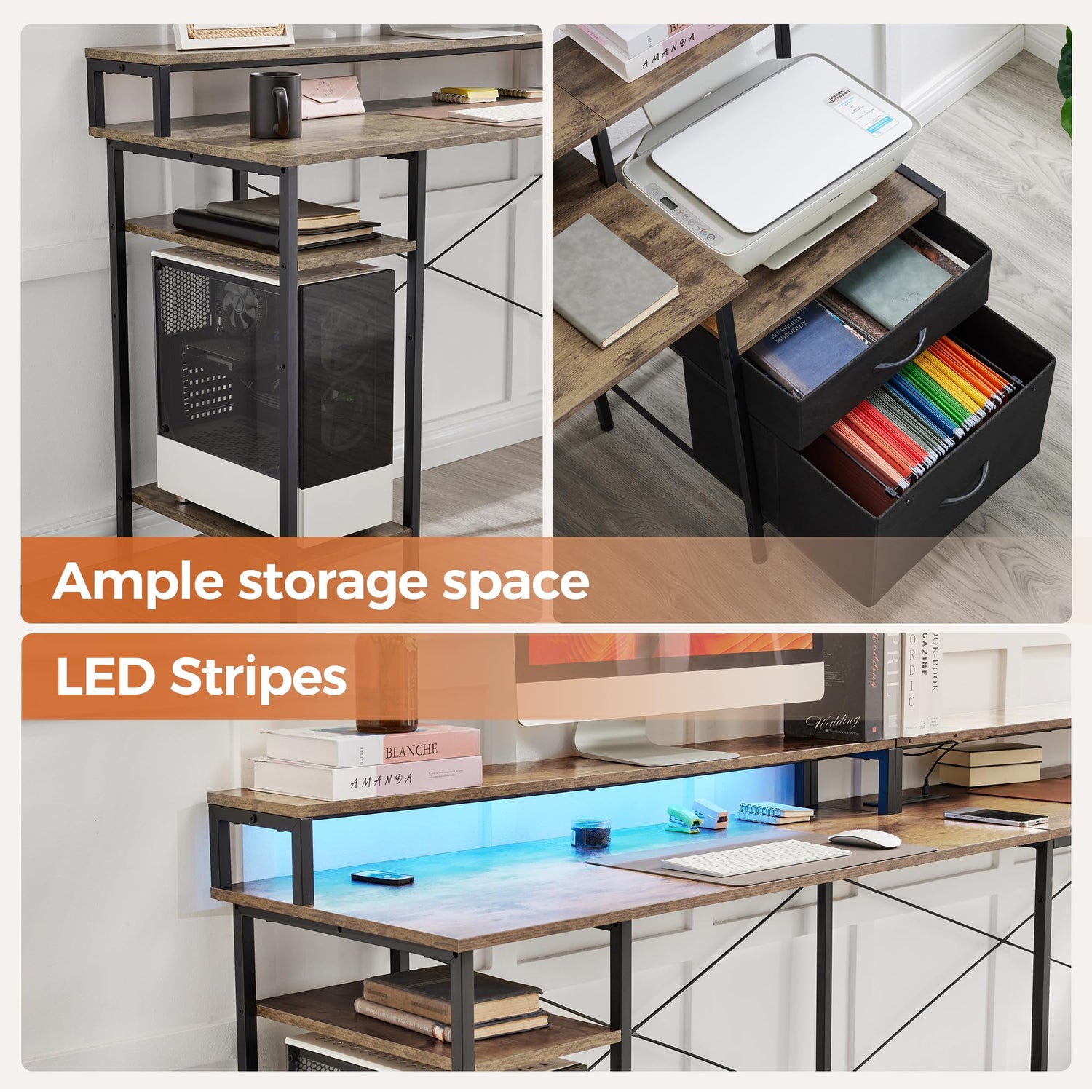 - 【Gaming Desk with Colorful LED Lights】The light strip has three adjustable color settings, which can create a comfortable light atmosphere. Whether you are working, studying or gaming at night, it can effectively reduce eye fatigue. Meanwhile, it can also enhance the ambience and the sense of technology of the environment.