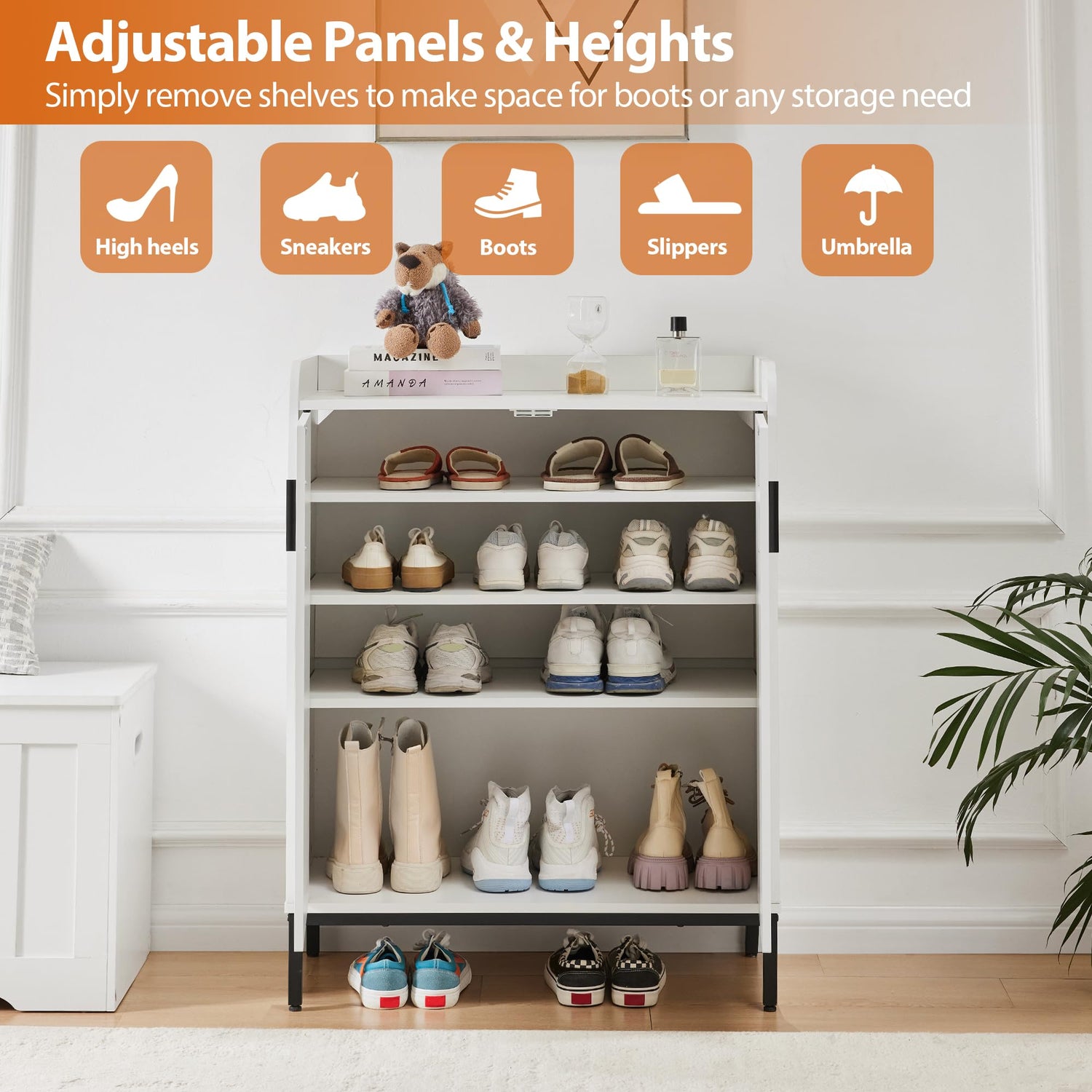 - Adjustable shelves--This tall storage cabinet comes with five adjustable shelves, which can easily accommodate shoes of various shoe shapes and sizes such as flats, sneakers, high heels or mid-tube boots. Thanks to the adjustable shelves of the shoe cabinet, you can disrupt the spatial structure of your shoe cabinet at any time to provide ample storage space for your entryway.