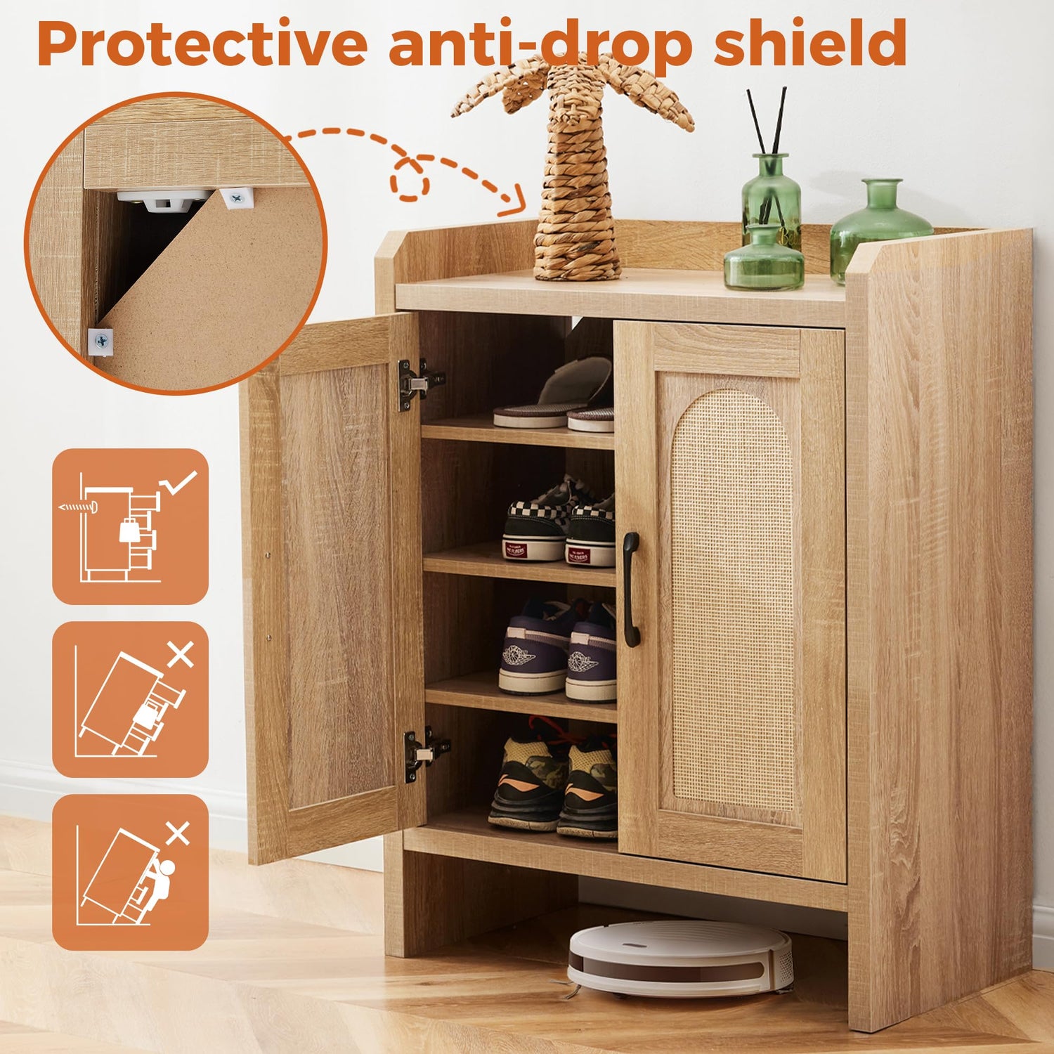Mericonia Shoe Cabinet Storage for Entryway, Natural Rattan Shoe Storage Cabinet, Wooden Shoe Rack Cabinet, Farmhouse Boho Wood Shoe Organizer Cabinet for Hallway