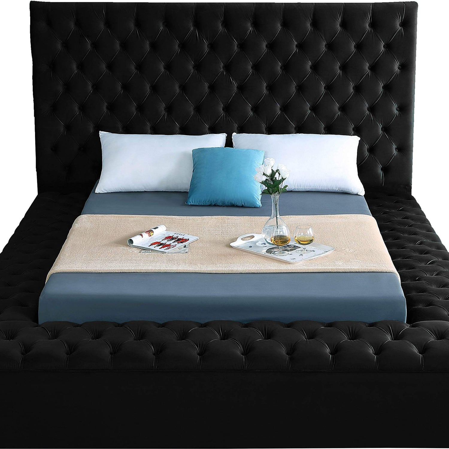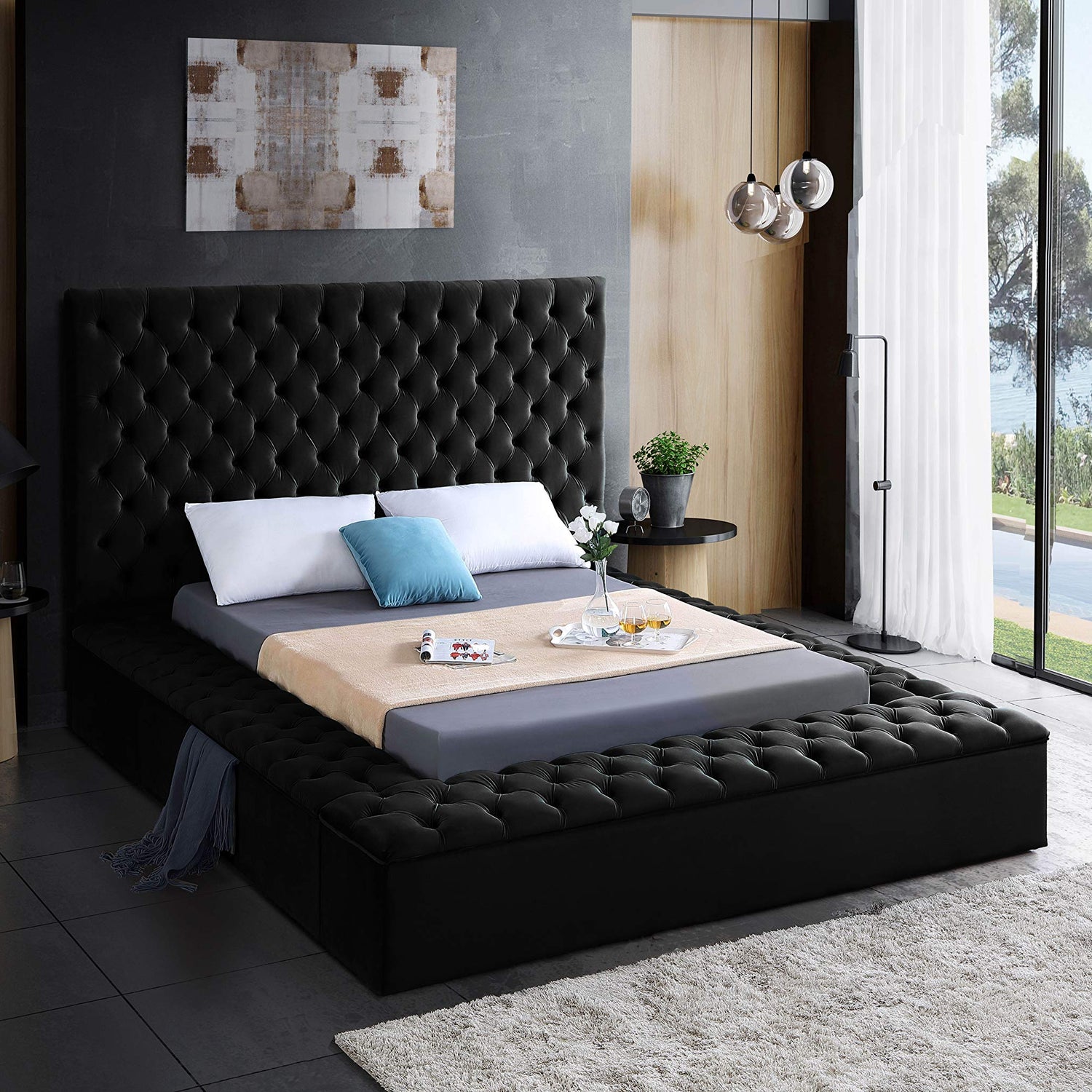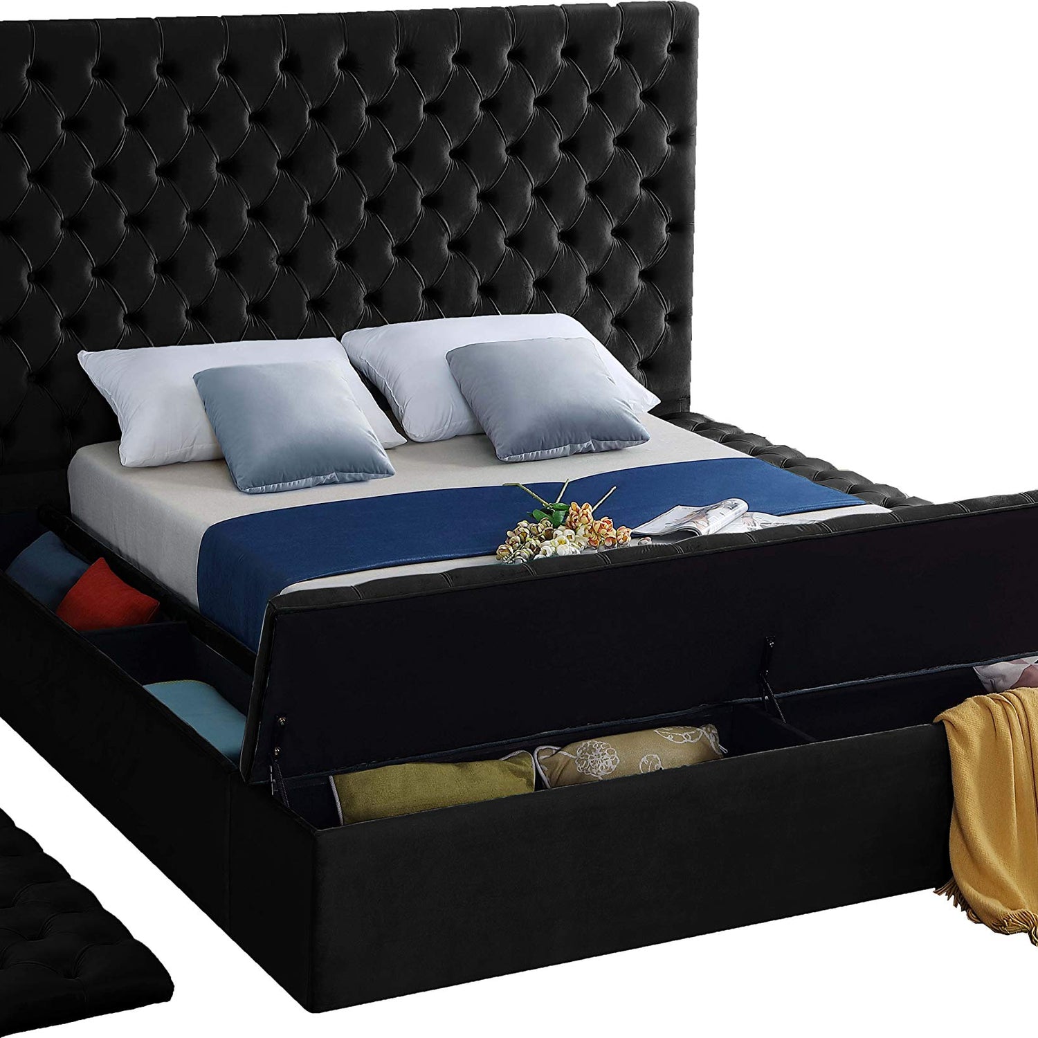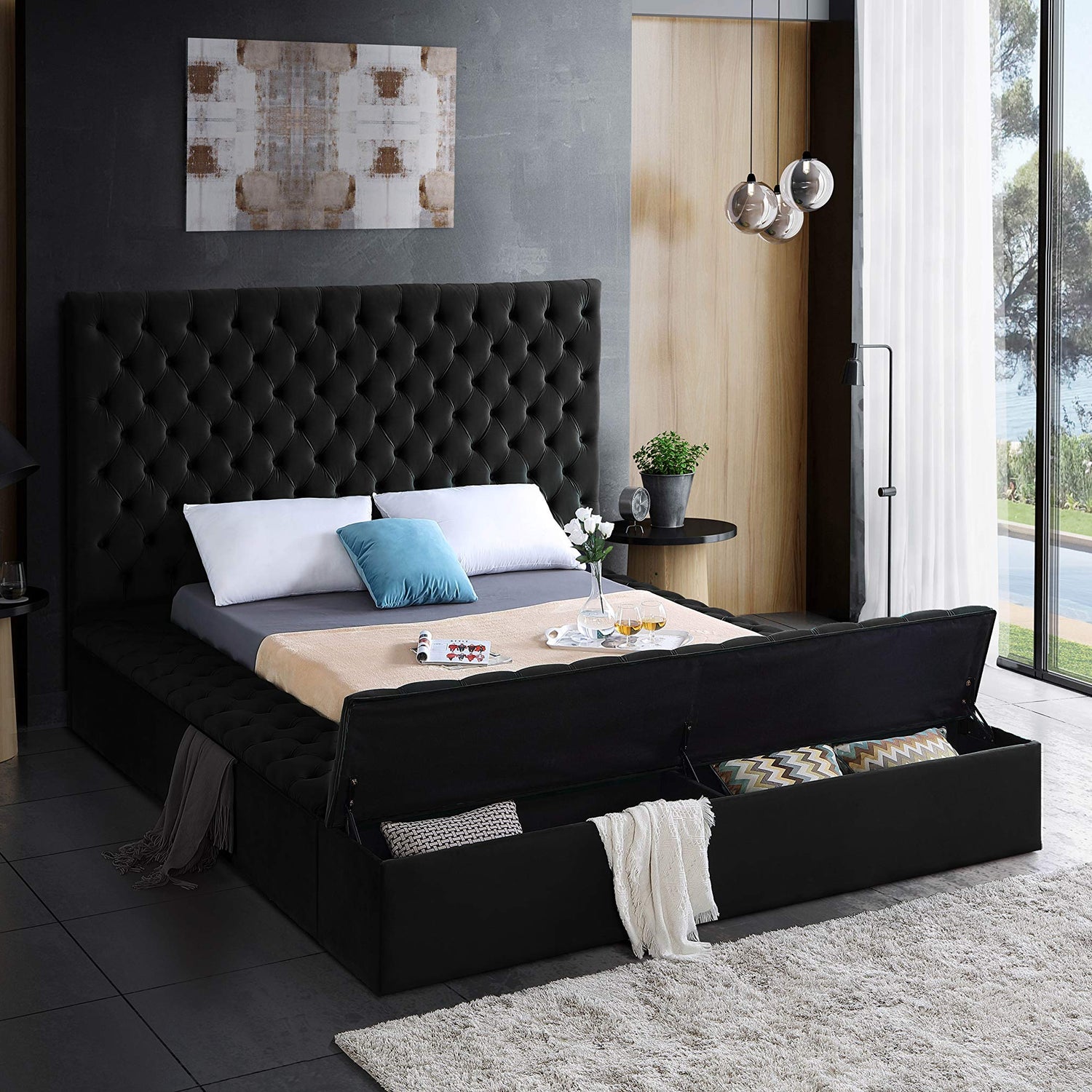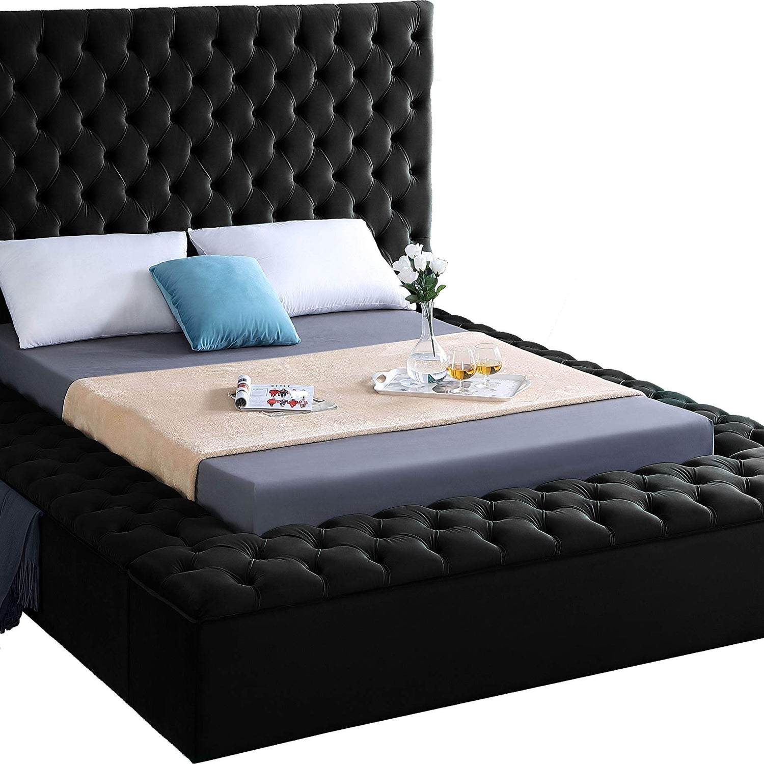 Meridian Furniture Bliss Collection Modern | Contemporary Velvet Upholstered Bed with Deep Button Tufting and Storage Compartments in Rails and Footboard, Black, King