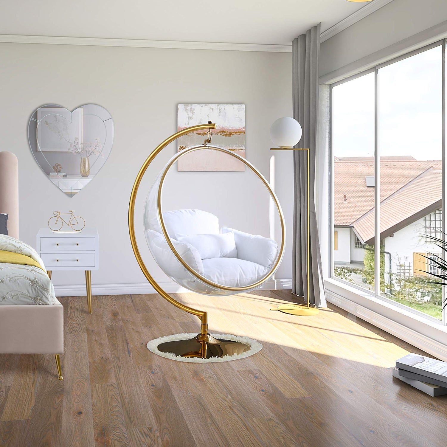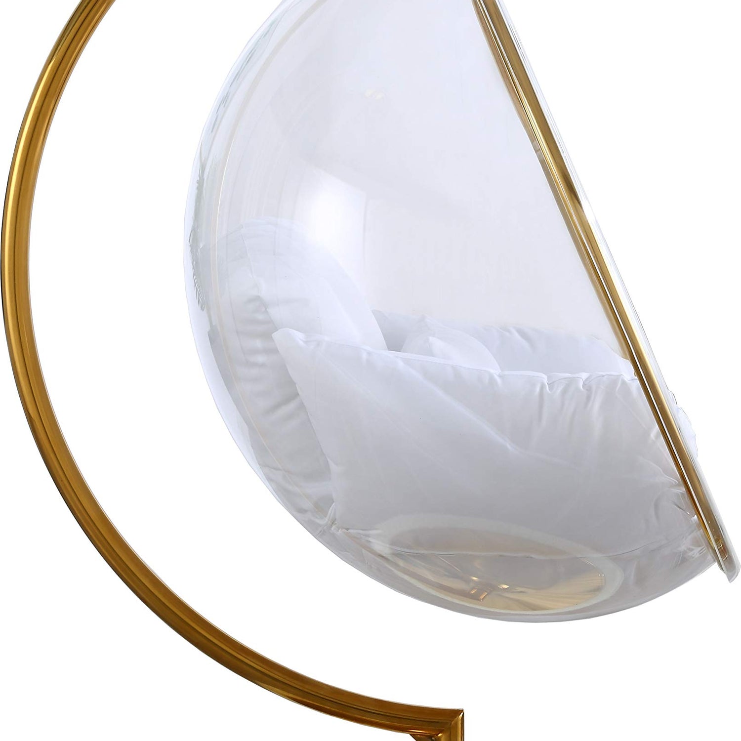 Details: Retreat to your own little bubble, literally, in this Luna acrylic swing bubble accent chair. What a modish addition to your living room, bedroom or other space! This Luna chair features an acrylic egg-style seat topped with fabric-covered cushions for supreme comfort. The metal base and frame provides sturdy support so that you can chillax to your hearts content in your very own sanctuary.