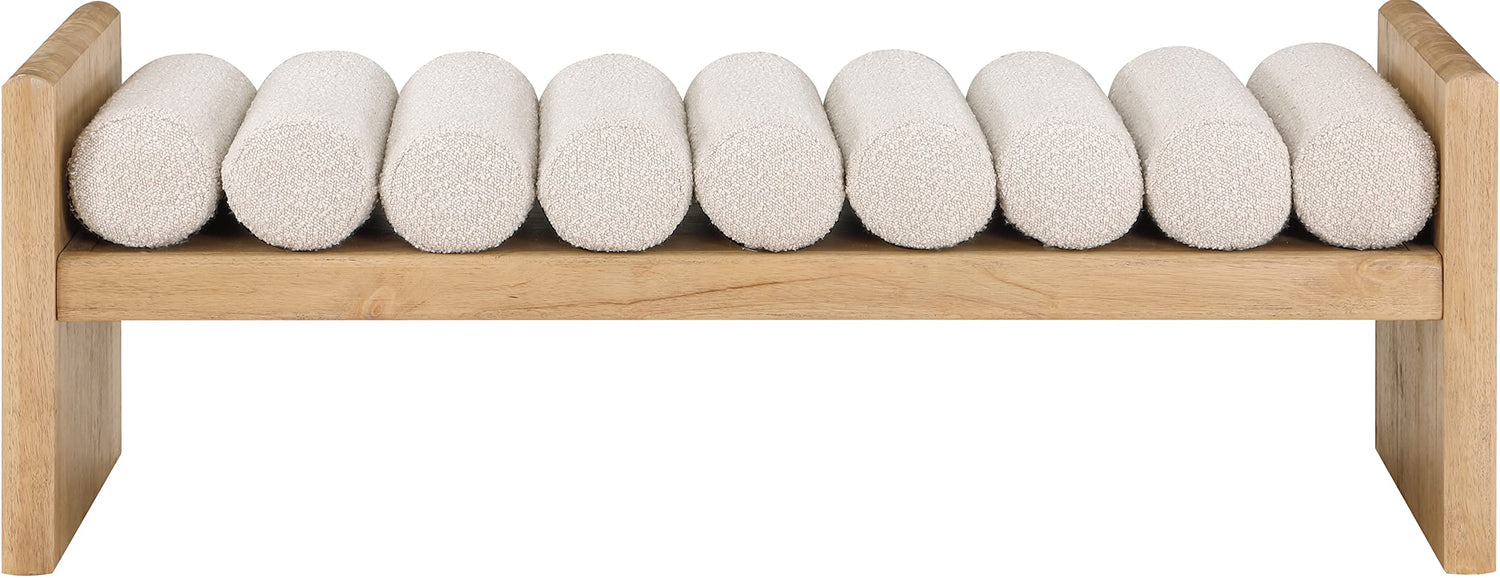 Details: Add originality to your home with this unique bench from Meridian Furniture's Waverly collection. Crafted using solid rubber wood, this bench makes a bold statement in any living space. Its H-shaped design holds nine boucle fabric cushion rolls on top, providing a comfortable place to sit for you or your guests. It's big enough to seat more than one person, providing you with extra seating space, and its contemporary design is perfect for any modern home.