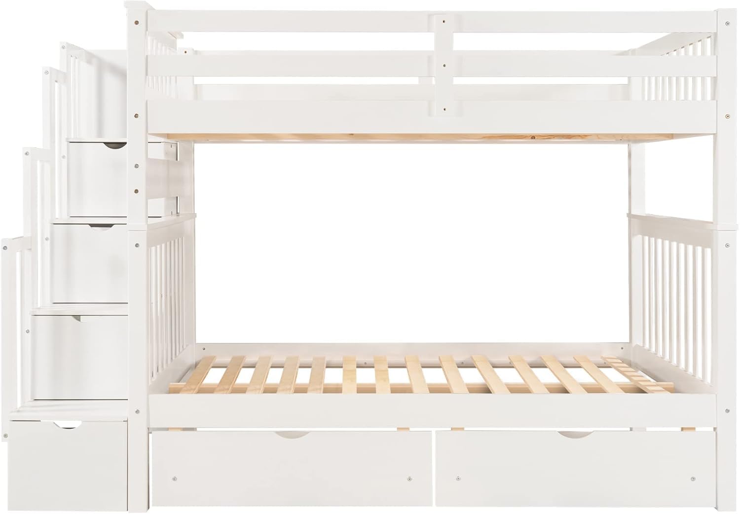 - Full Bunk Bed with Storage Staircase] With a four-step set of stairs, this bunk bed provides easy and safe access for getting in and out of the top bunk. Also, given the width of the stairs they also double as very functional storage and help you change the quilts and bed sheets effortlessly when compared with traditional laddered bunks. And the staircase can be placed on both sides of the bed.