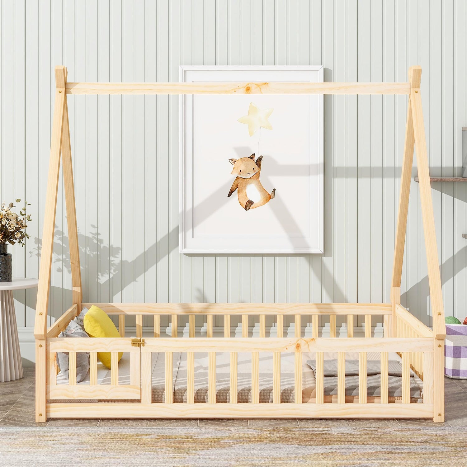MERITLINE Natural Full Size Montessori Floor Bed with Teepee Design and Fence Rails for Kids