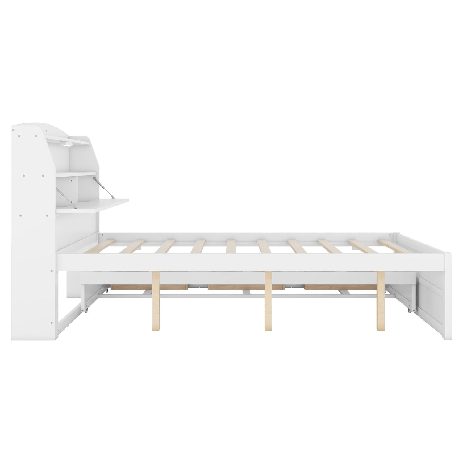 MERITLINE LED Platform Bed with Trundle, Drawers, and Bookcase Headboard - White Full Size Frame with USB Ports