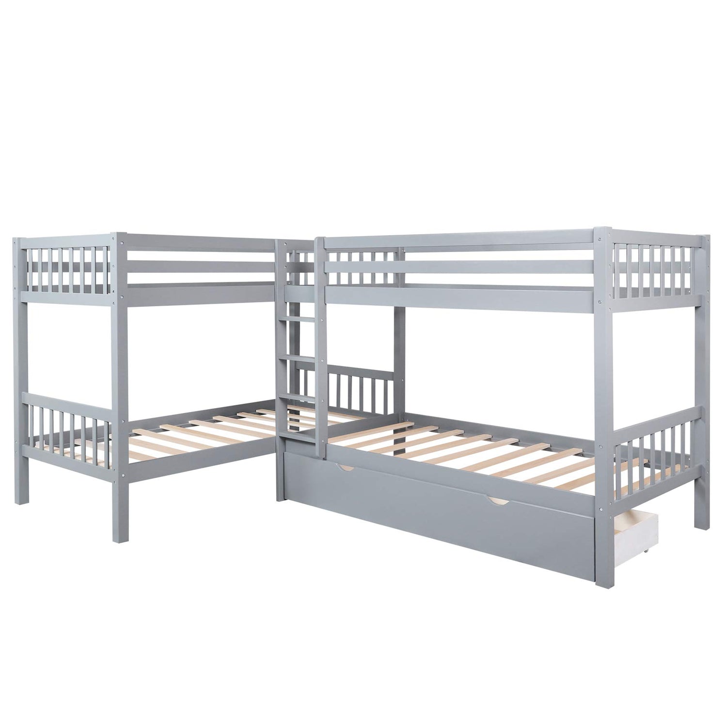 MERITLINE L-Shaped Bunk Beds for 4, Twin Over Twin Bunk Beds with Storage Drawers, Solid Wood Quad Bunk Beds for Kids, Teens, Girls,Boys, Grey