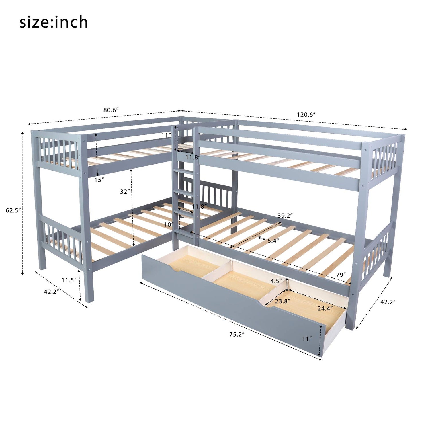 - 【Versatility L Shaped Bunk Beds】 This wood quad bunk bed features two twin size upper beds and two twin size bottom beds for accommodating your kids or any overnight sleepers. What's more, three drawers underneath can store your little ones' toys and bedding.