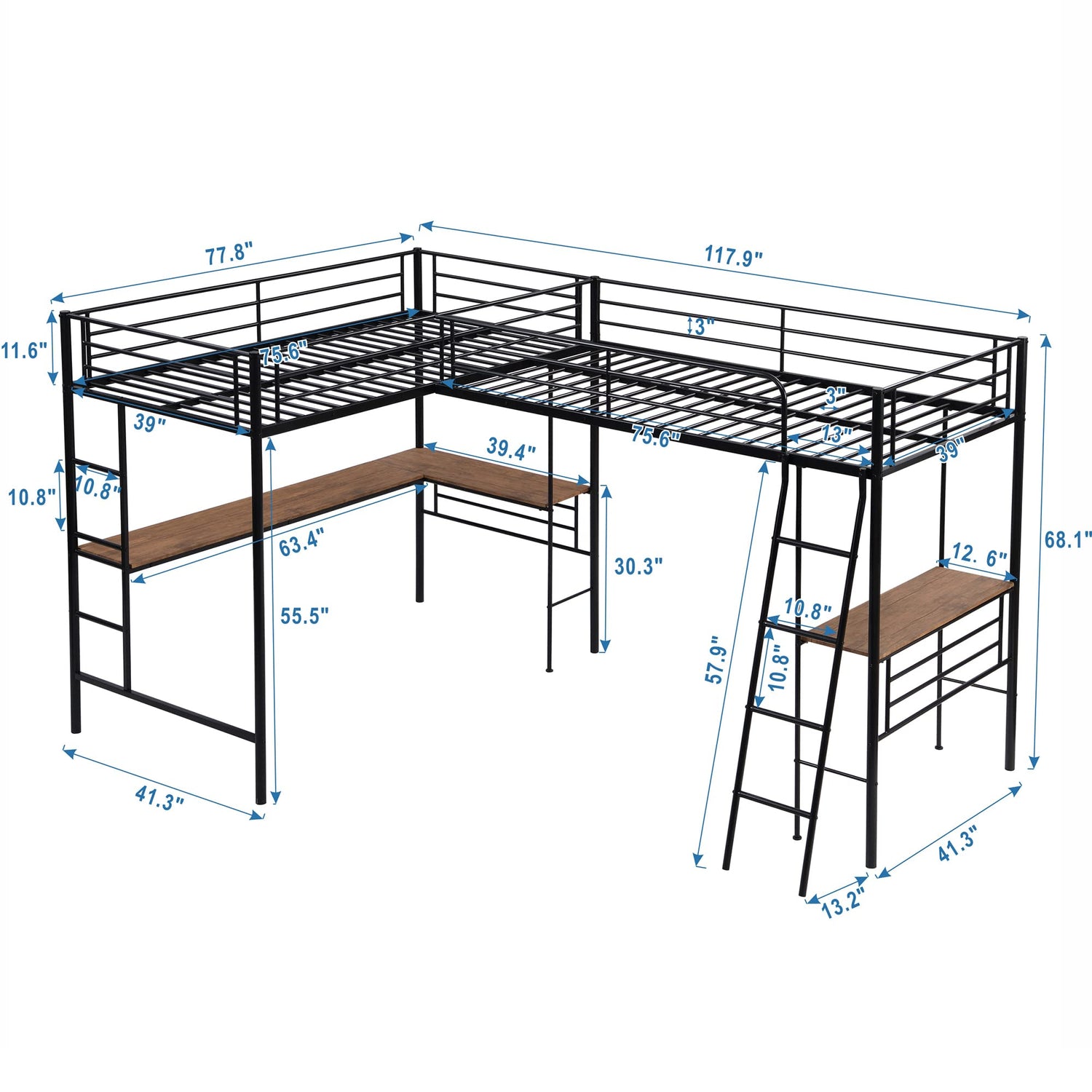 MERITLINE Metal Twin Size L-Shaped Loft Bed, Twin Size Loft Bed Frame with Two Built-in Desks Underneath for Kids Boys Teens, Black