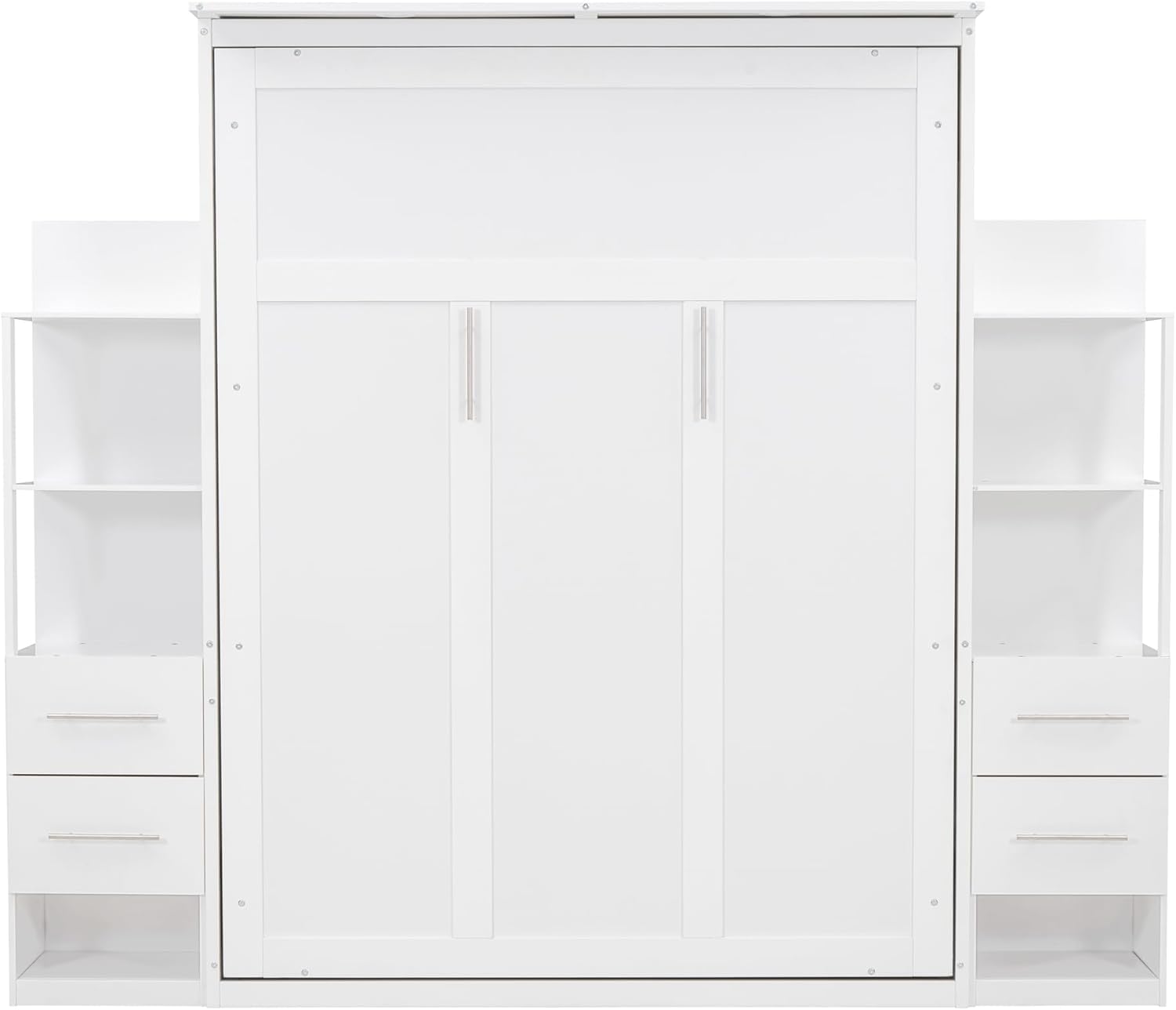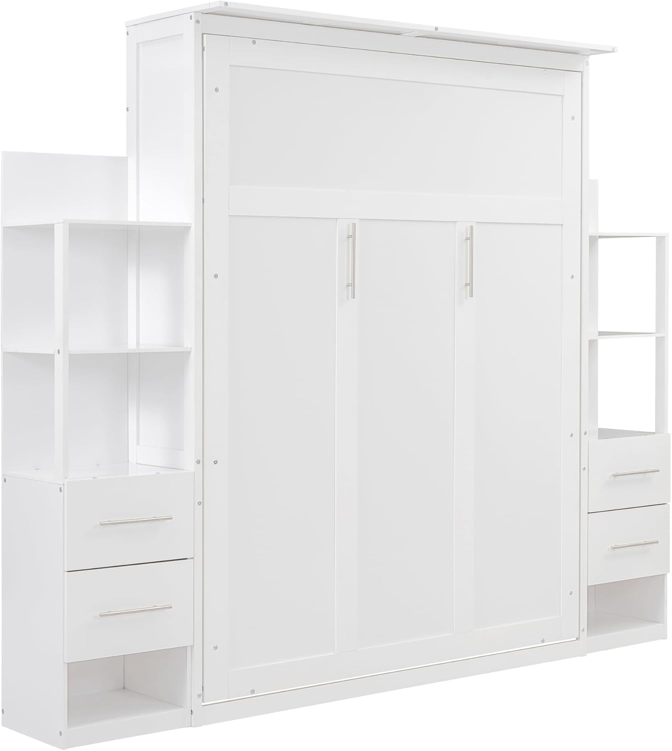 MERITLINE Queen Murphy Bed with Storage Drawers,LED Lights and Shelves,Wood Murphy Wall Bed Cabinet for Adults (White)