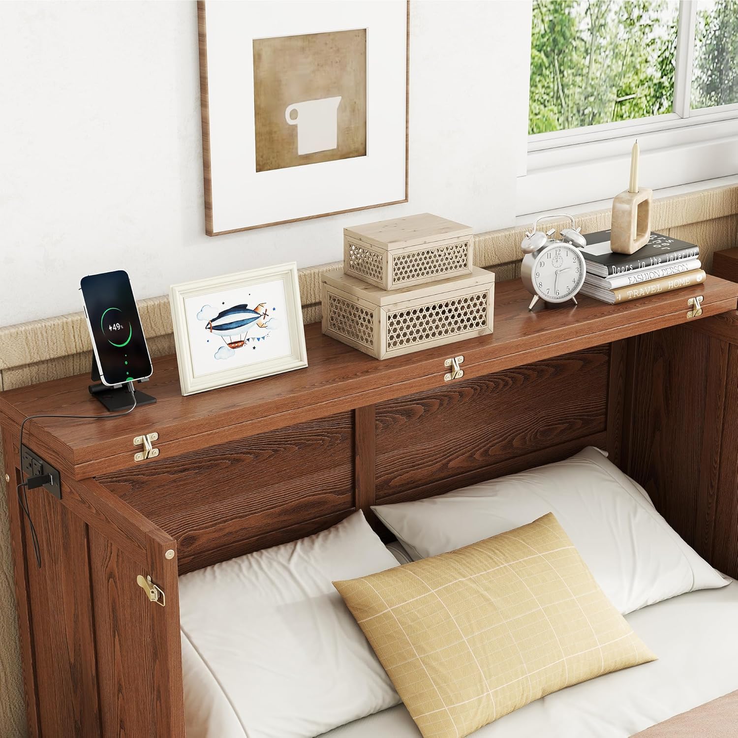 MERITLINE Solid Pine Wood Full Murphy Bed with Storage Drawer and Charging Station,Wood Folding Walnut Murphy Chest Bed Cabinet for Adults