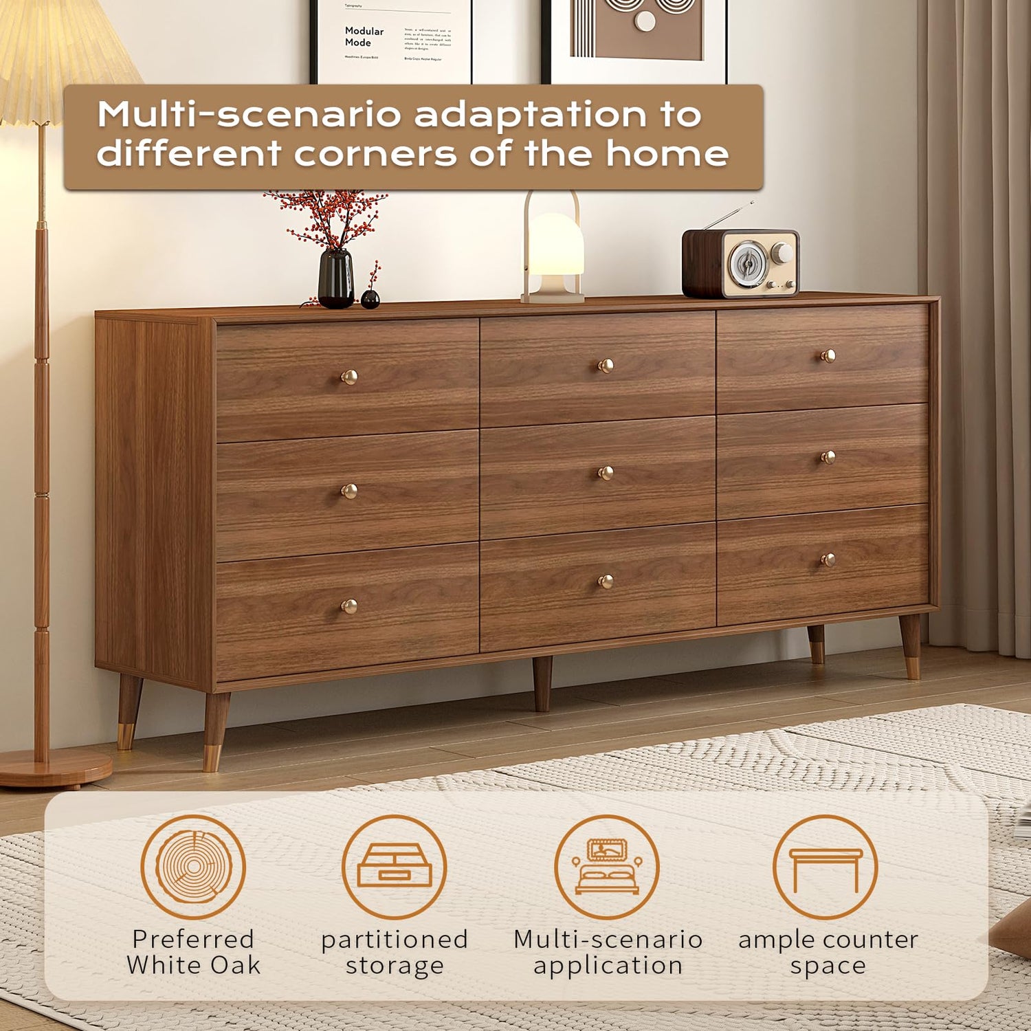 Messenya Mid Century Modern 9-Drawer Dresser, 63 Inch Wide Solid Wood Frame Chest, Walnut Finish, Beveled Design, Heavy-Duty Drawer Glides, Storage Cabinet for Bedroom, Living Room, TV Stand