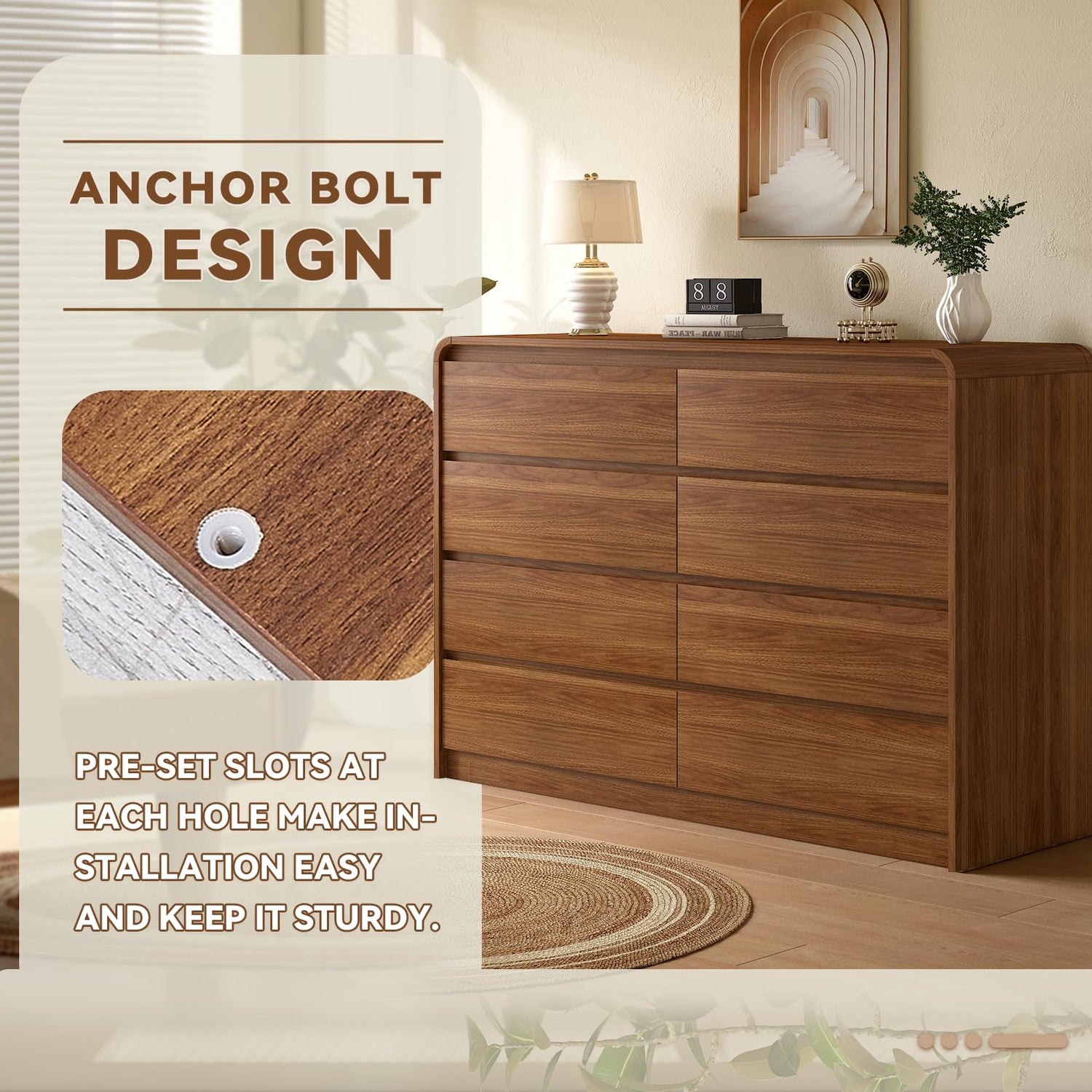 Messenya Modern 8-Drawer Dresser 55-Inch Wide, Curved Anti-Collision Design, Mid-Century Storage Cabinet with Pre-Embedded Slots, Sturdy Reusable, Ideal for Bedroom/Living Room/TV (Brown, 8-55.1)