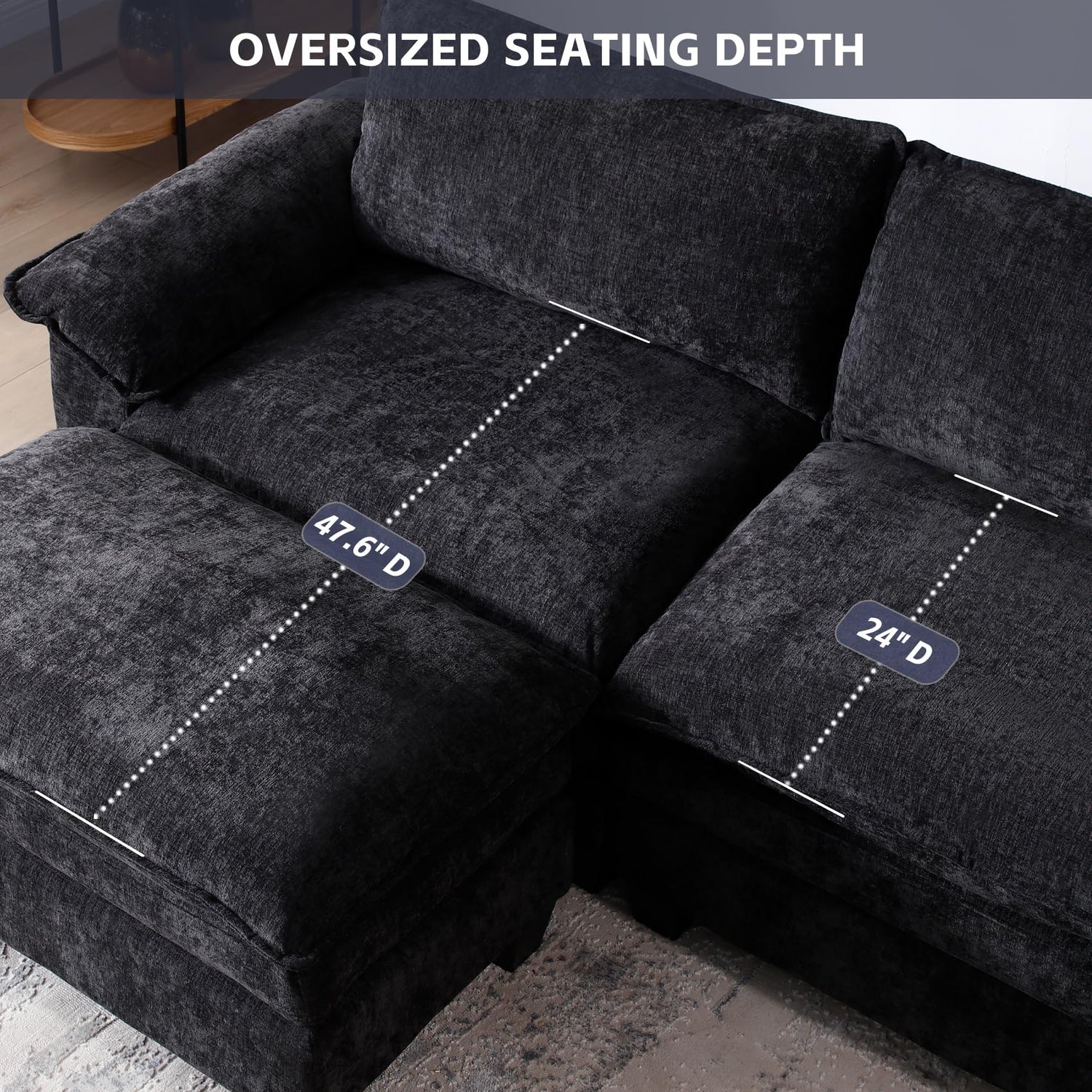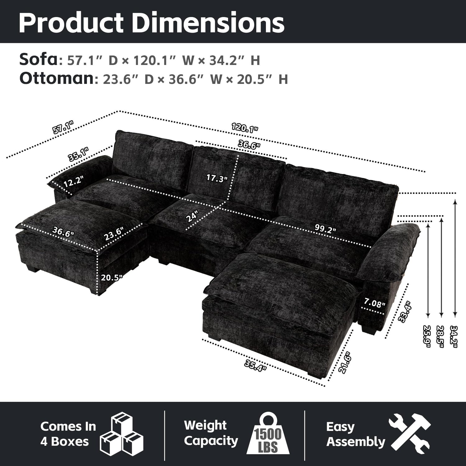 mestyl Modular Sectional Sofa Comfy Cloud Couch, U Shaped 3 Deep Seat Sofa Couch with 2 Ottoman, 120" Soft Modern Couches Set for Living Room, Chenille, Black, MT001