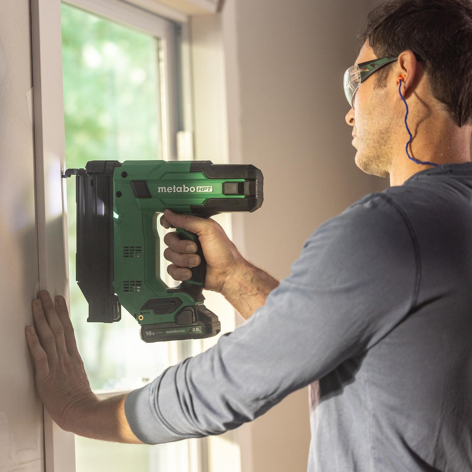 Details: The Pro Preferred Brand of Pneumatic Nailers introduces an 18V MultiVolt 18-Gauge Cordless Brad Nailer (model - NT1850DG) that will meet the expectations of both the DIYer and the Pro. This cordless brad nailer allows you to work wherever you want without the need for a loud compressor or hose. It features the power to drive up to 2" 18-Ga brad nails and the 2.0Ah 18V battery with fuel gauge lets you drive up to 700 brads per charge. It features Metabo HPT"s unique low maintenance Mechanical Spring Drive System. With this type of power and run time, you can complete your job on time without needing to stop for battery changes. The 18V Cordless 18-Gauge Brad Nailer is part of the expanding MultiVolt System 18-Volt and 36-Volt power tools from Metabo HPT. GO lighter with 18V batteries or GO longer with the unique MultiVolt battery that works on both 18V and 36V tools to double your runtime for up to 8.0Ah of runtime per charge for more power on the GO.