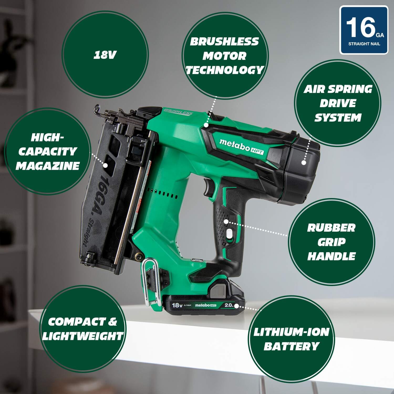 • POWER FINISH NAILER: Metabo HPT introduces the 18V MultiVolt Brushless 16 Gauge Finish Nailer, taking cordless nailing to the next level. This power tool now comes with an 18V 2.0Ah battery, featuring a fuel gauge for convenience. Metabo HPT is proud to build upon their strong pneumatic heritage and offer a professional-grade cordless option.