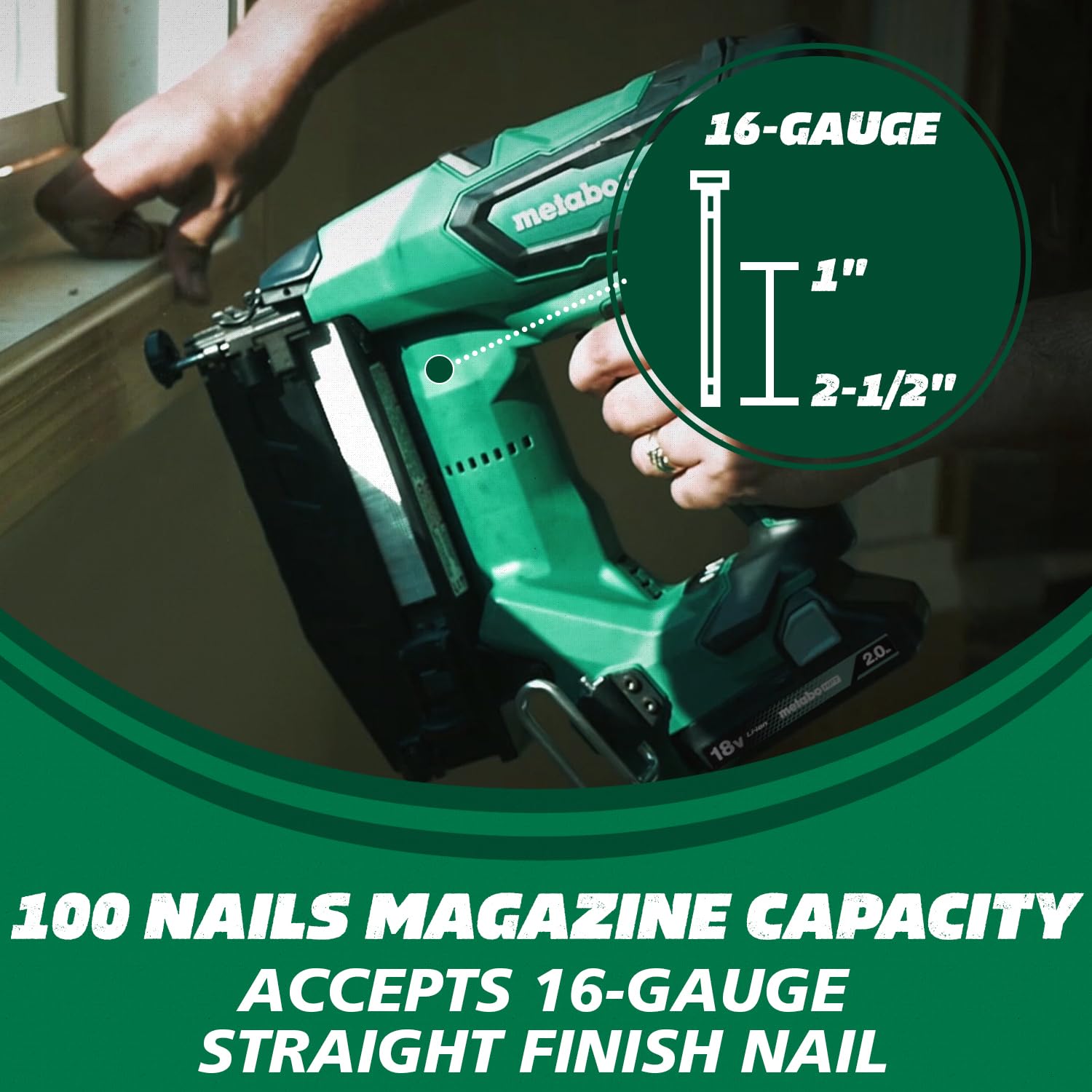 • FASTENERS: The power finish nailer from Metabo HPT accepts 1" up to 2-1/2" 16- Gauge straight finish nails. No need to refill an air tank with our cordless finish nailer, giving you faster action and making it ideal for all your professional and DIY jobs.
