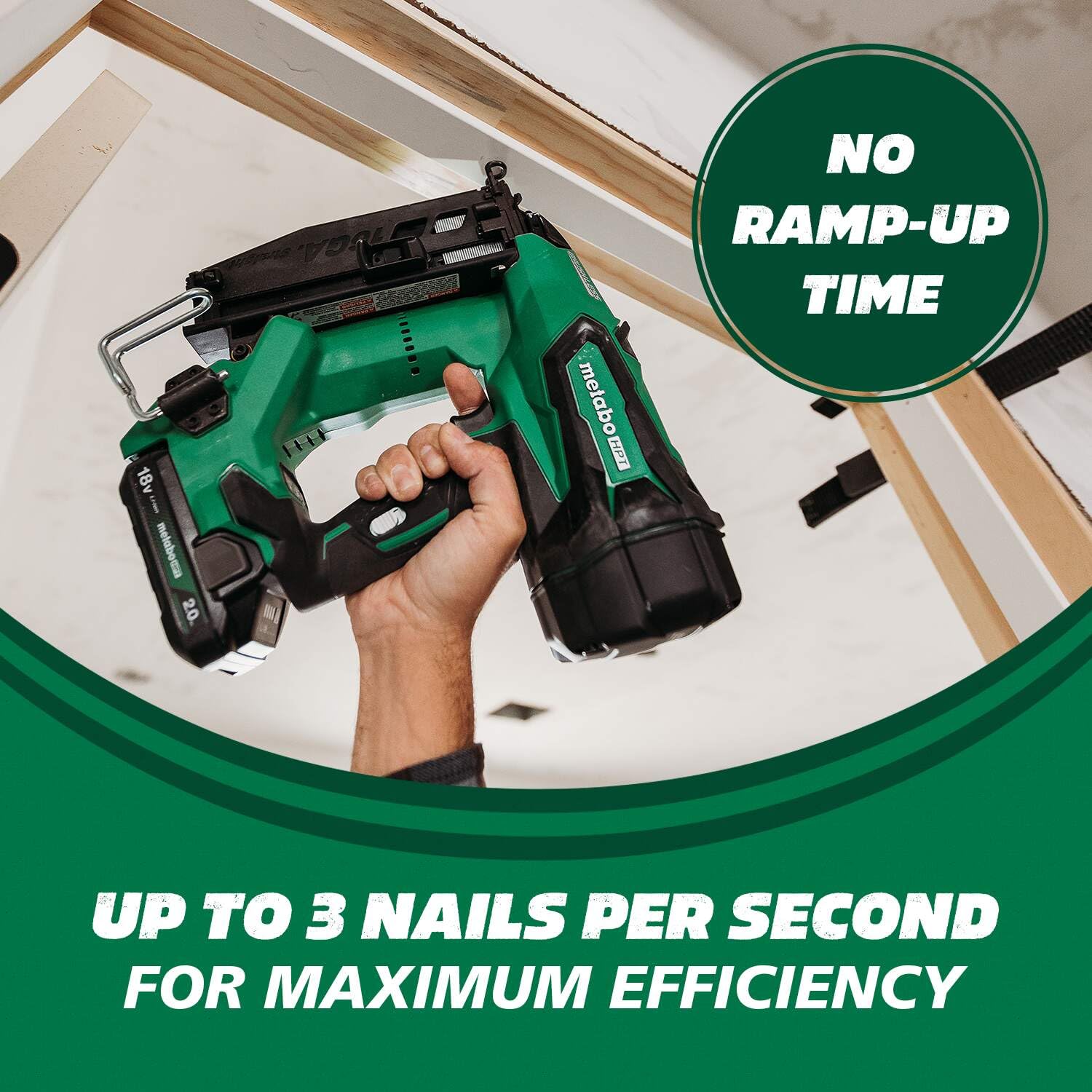 • LONG-LASTING PERFORMANCE: Metabo HPT's cordless finish nailer delivers performance similar to a pneumatic tool thanks to its air spring drive system. This 16 gauge finish nailer provides long-lasting performance with 950 finish nails per charge using the included compact 18V 2.0Ah Battery. Go faster with this power tool, with up to 3 nails per second with no ramp-up time.