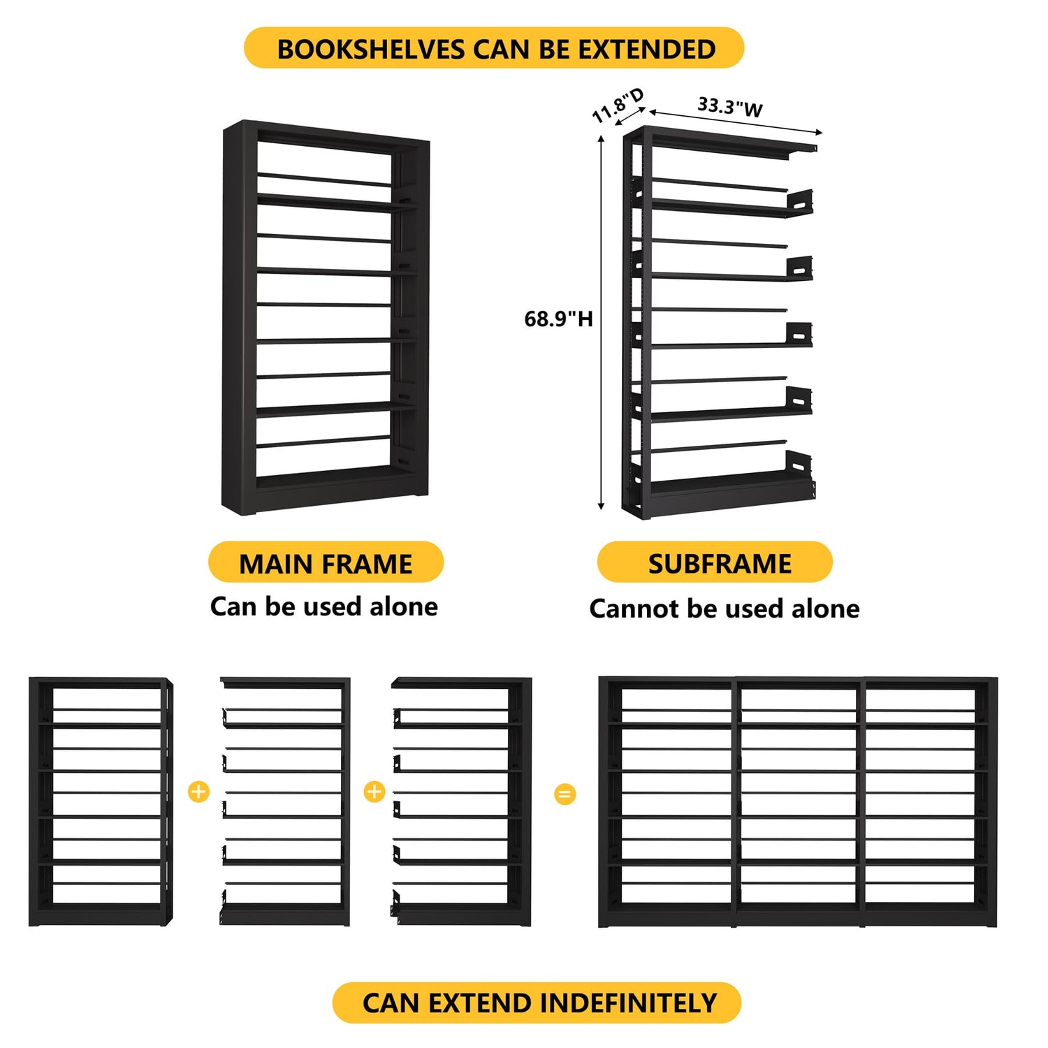 - 【Large Size】Size: H68.9*W36*D11.8 inch.Taller and wider black bookcase.There are adjustable bookends on the back to stop the books from falling.This steel bookshelf is ideal for storing more than just books. You can use it to display family photos, plants, decorations, and even electronics to improve space utilization. Whether it is study, living room, office, or workplace, it can be adapted to meet your different storage needs