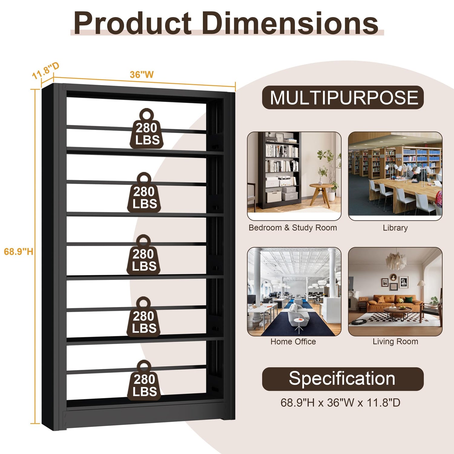 - 【Multi-scenario】This industrial-grade steel bookshelf isn’t just for books! Perfect for organizing toys, shoes, vinyl records, kitchen pantry items, tools, and collectibles. Its rust-resistant, powder-coated metal frame handles heavy loads (up to 280 lbs/shelf), making it ideal for garages, basements, dorm rooms, and home offices
