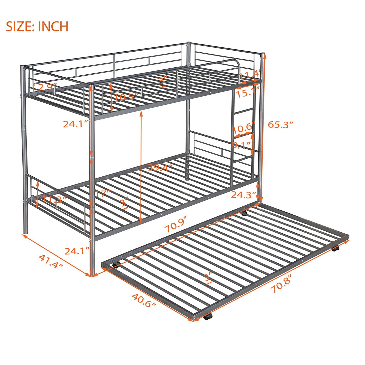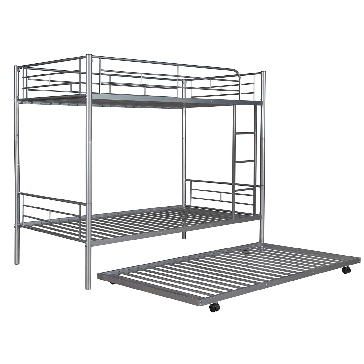 Metal Bunk Bed with Trundle Twin Over Twin Bunk Bed Frame with Ladder and Safety Rails for Kids Triple Metal Bunk Can be Divided into Two beds, Silver