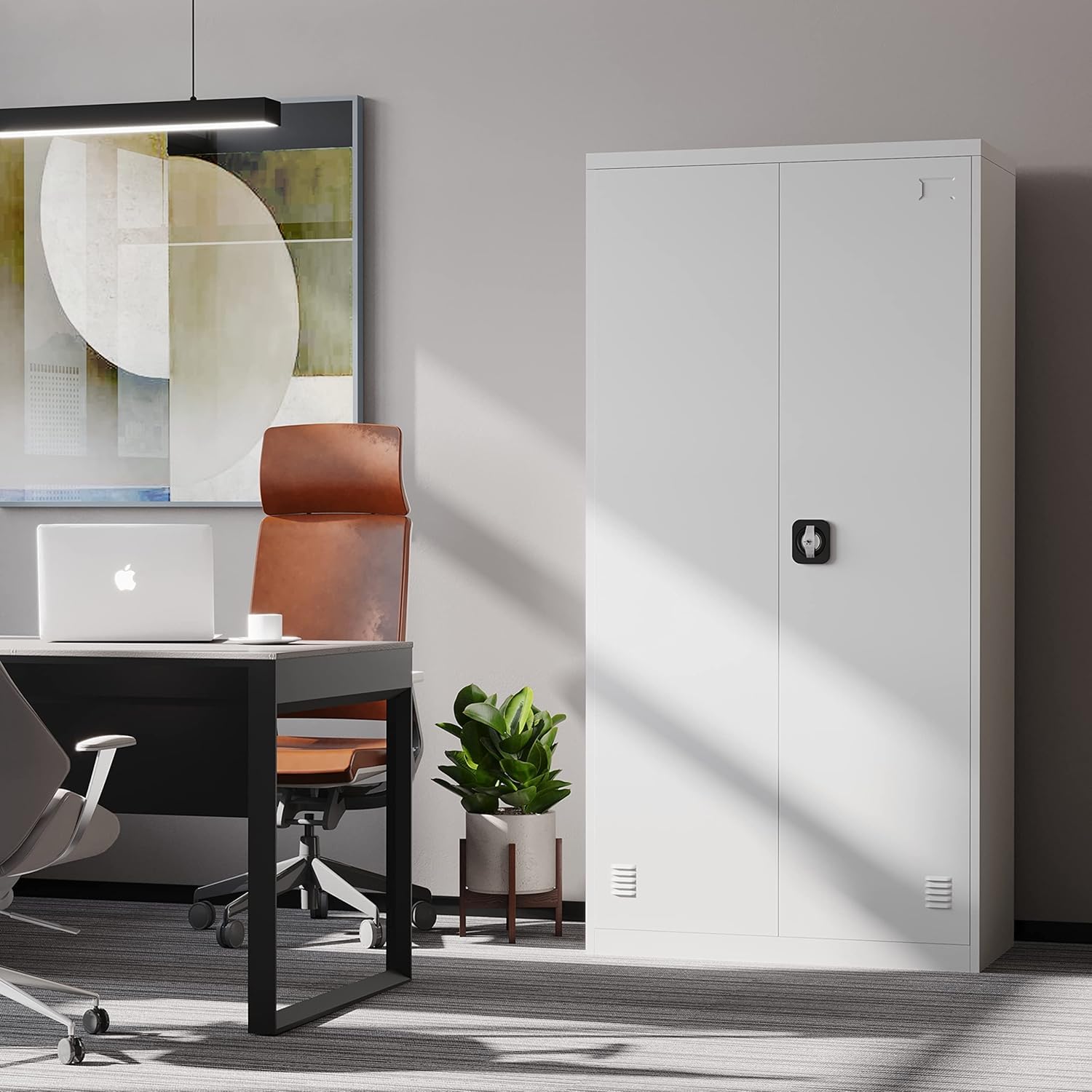 Metal Garage Storage Cabinet, 72" Tall Steel File Cabinet with 2 Lockable Doors and Adjustable Shelves, Utility Heavy Duty Tool Cabinet for Warehouse, Garages, Offices, Kitchens, Gyms, Milky White