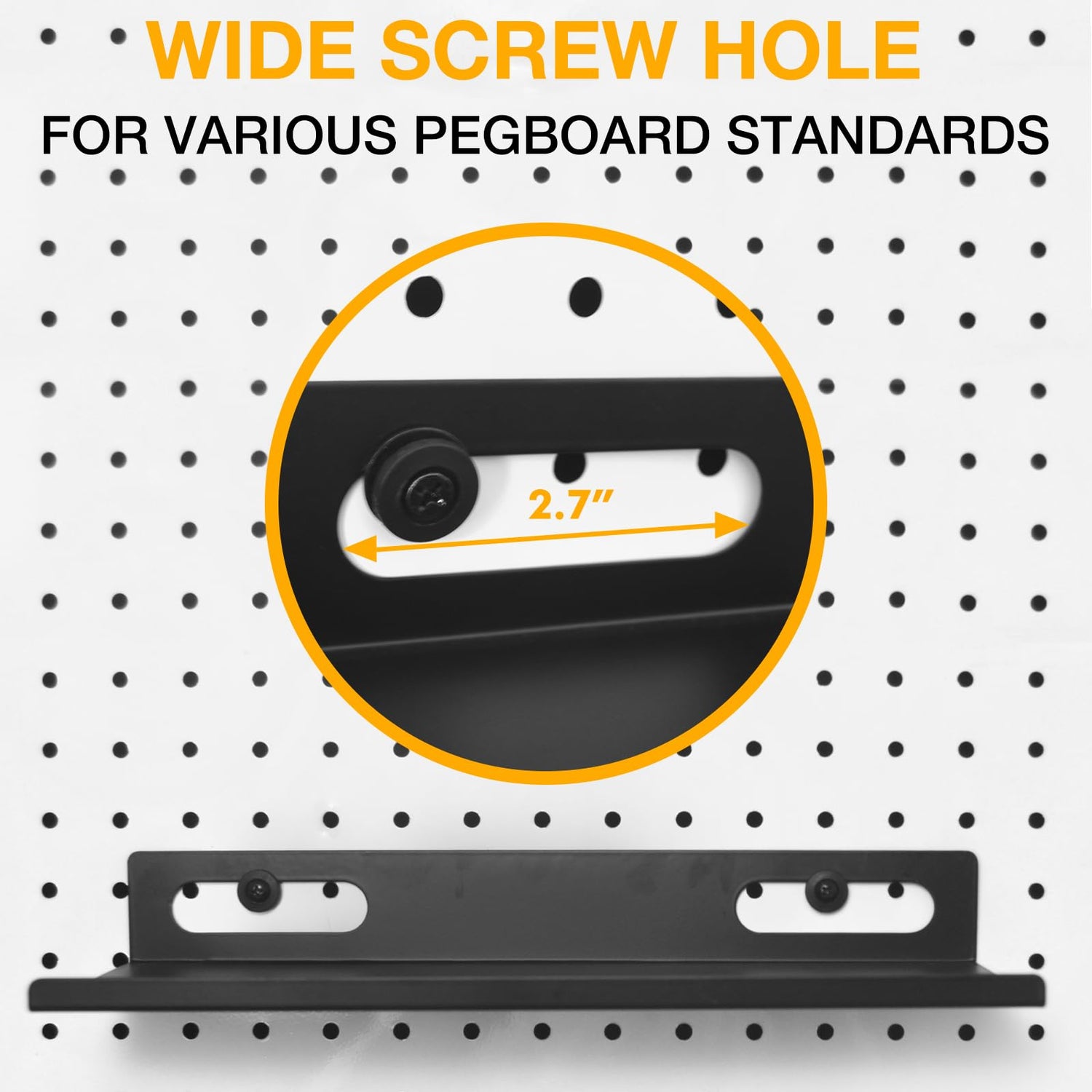 - Universal Compatibility - Featuring an enlarged screw mounting opening, these peg board shelves fit various pegboard types with different hole sizes and spacings. The set includes both small and large anchors for a perfect fit on any pegboard.