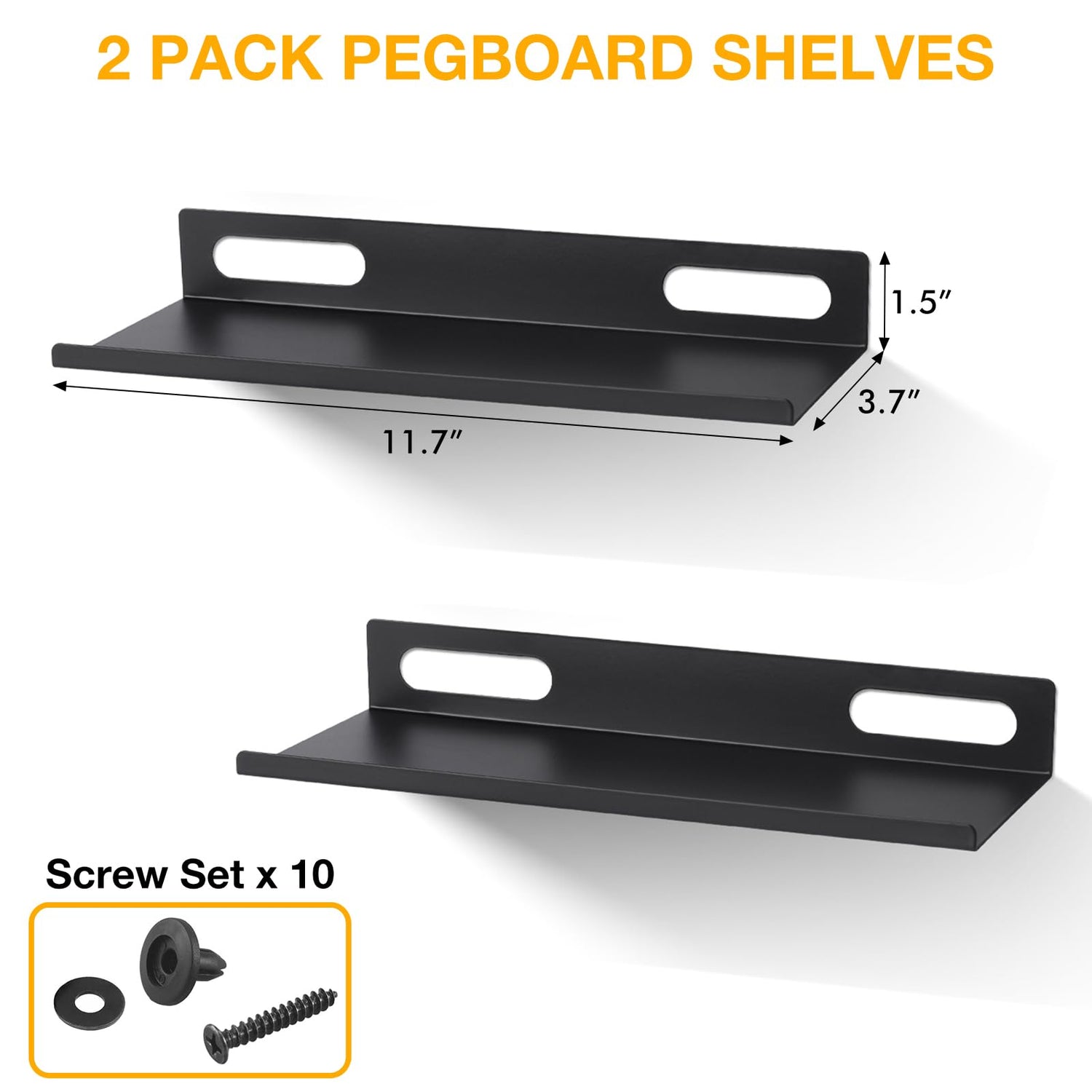 - Easy Installation - No drilling required for lightweight use under 7lbs. Simply mount the shelves directly onto a pegboard using the included screws and screwdriver. And the drilling option is for wood or composite pegboards, supporting up to 22 lbs.