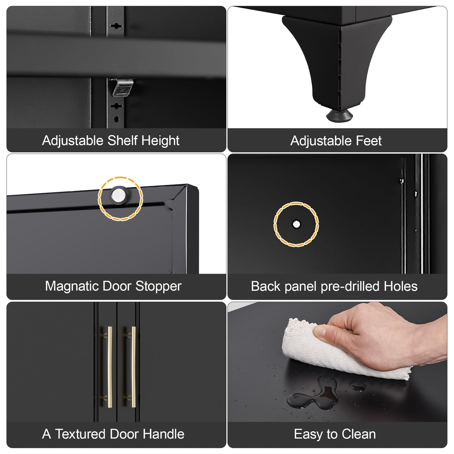 • Stylish Design: Metal storage cabinet door features a sleek circl arc design, 2 gold handles and have magnetic door stops on the top inside of the doors. Black pantry storage cabinets adds character and charm to the home office