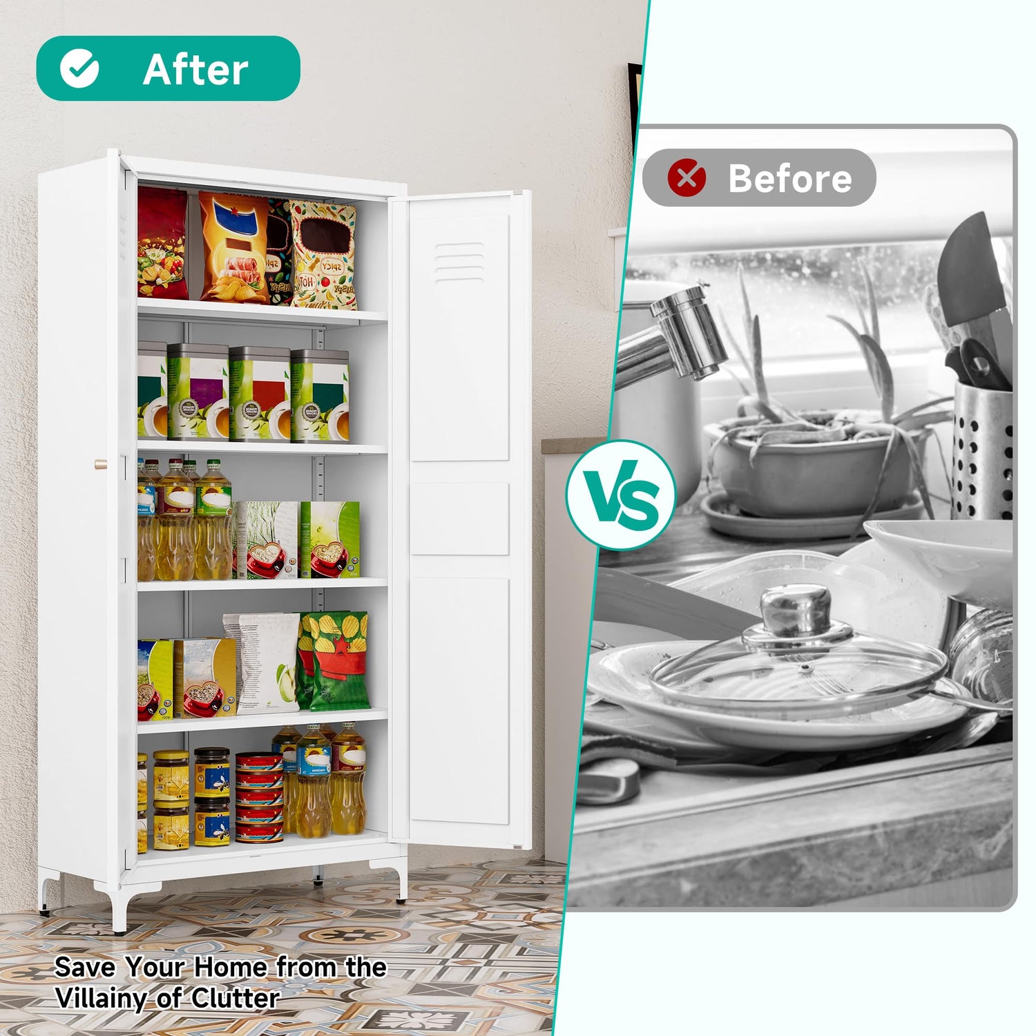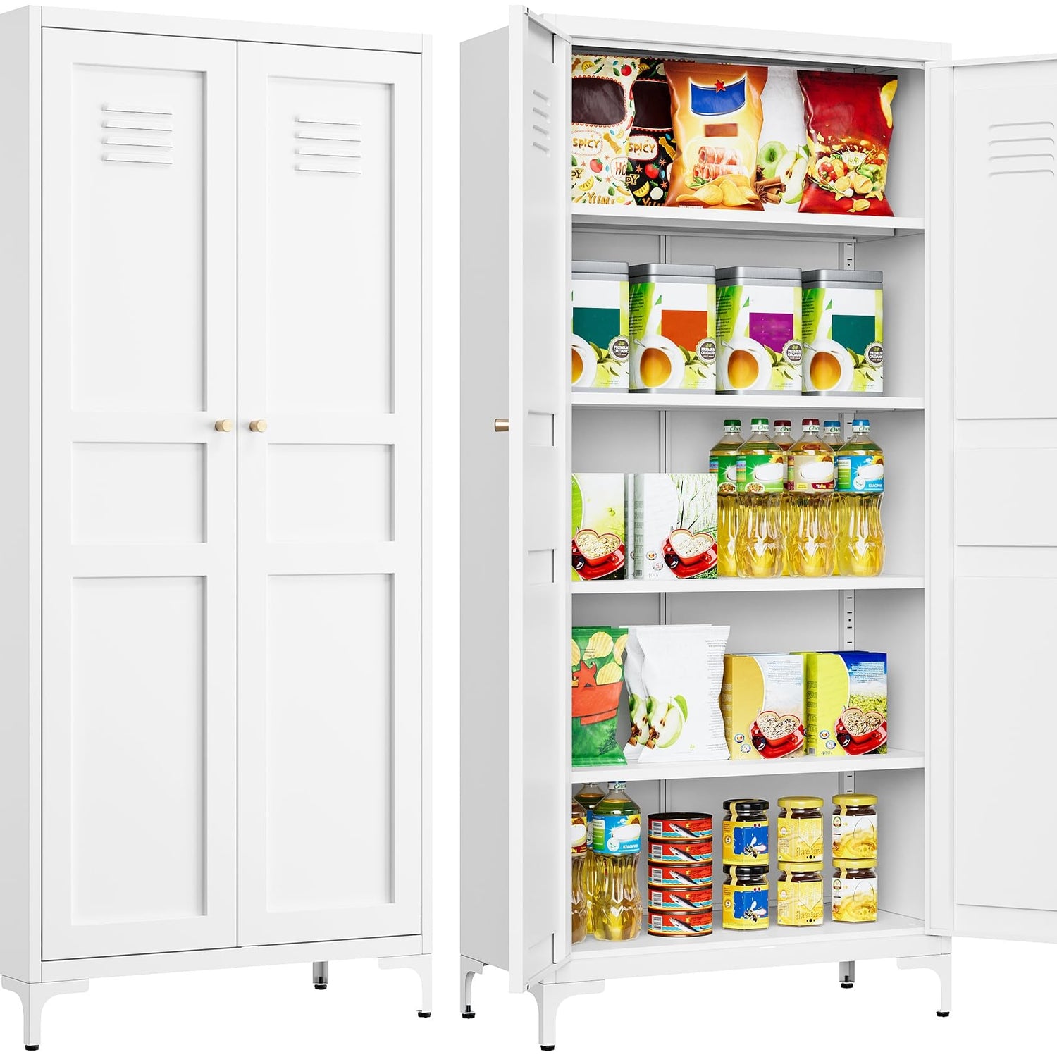 Metal Storage Cabinet with Doors and Shelves,White Storage Cabinet,Food Pantry Storage Cabinet,5 Tier Metal Pantry Cabinet,Tall Large Closet Cupboard for Home,Kitchen,Dining/Living/Laundry Room