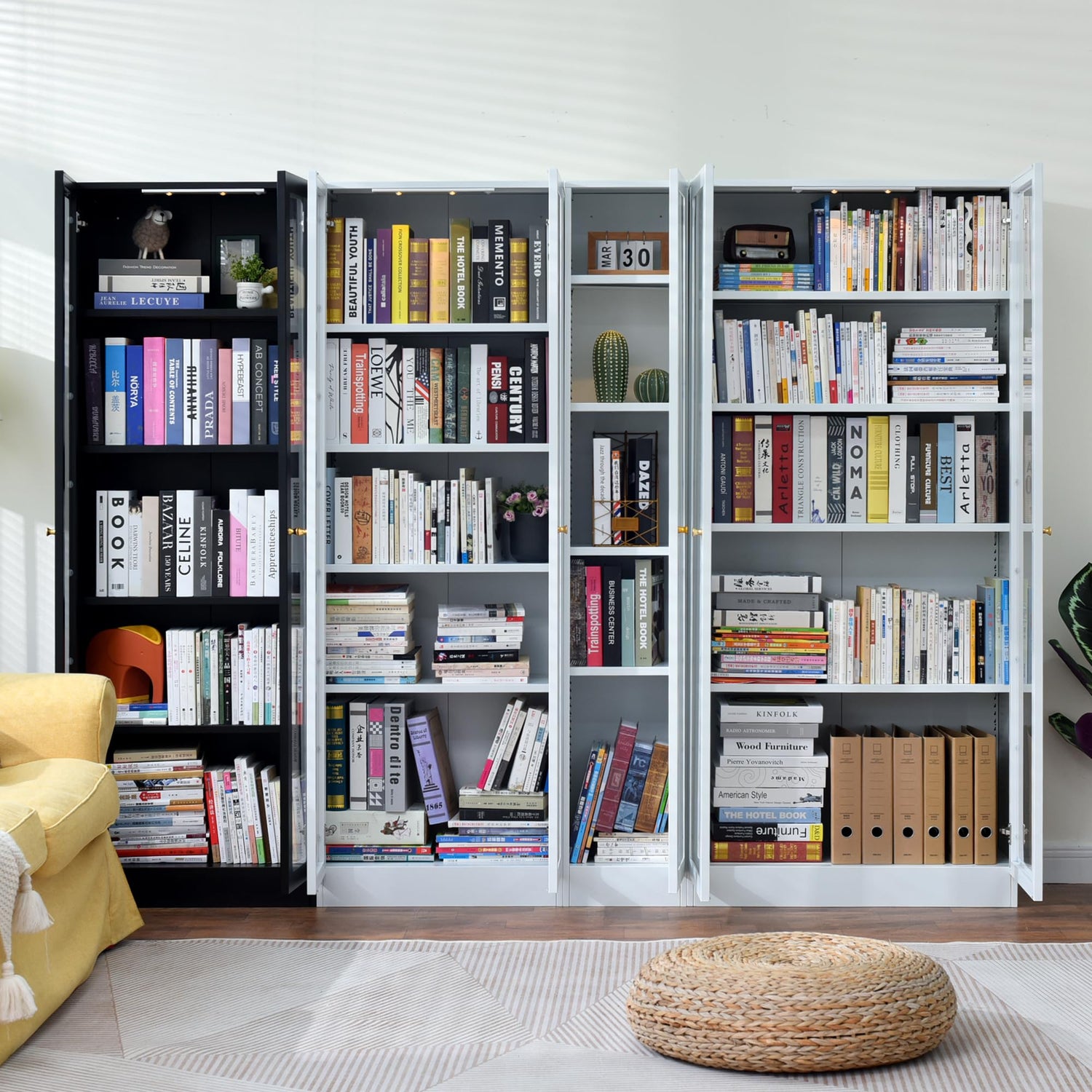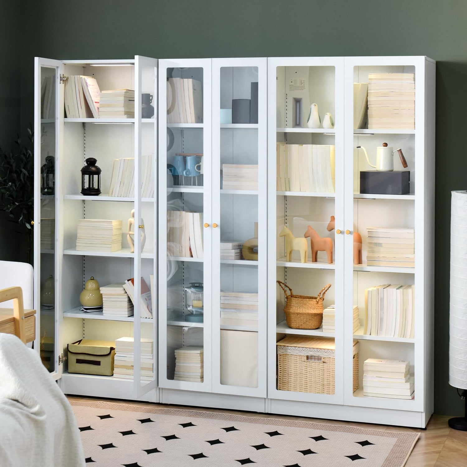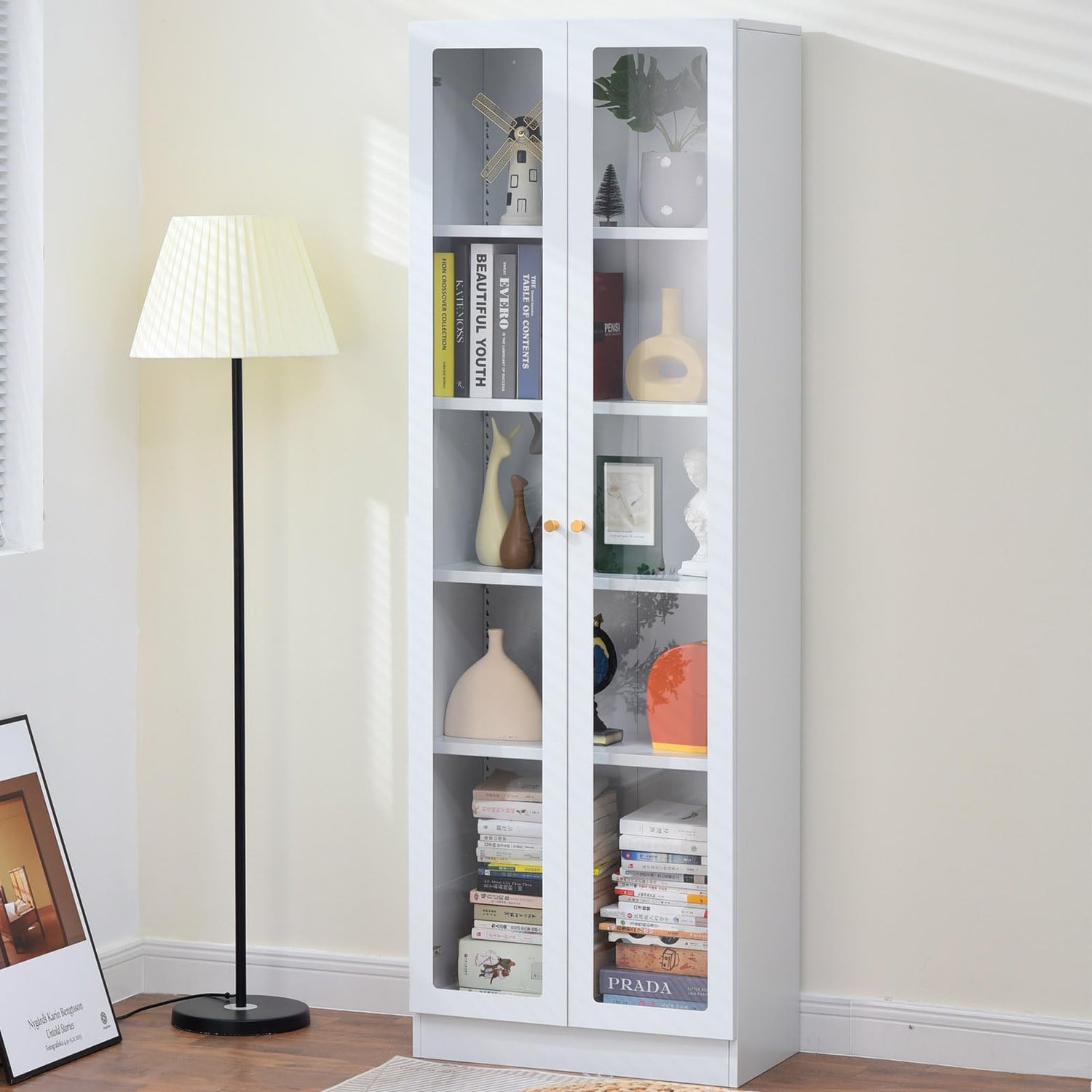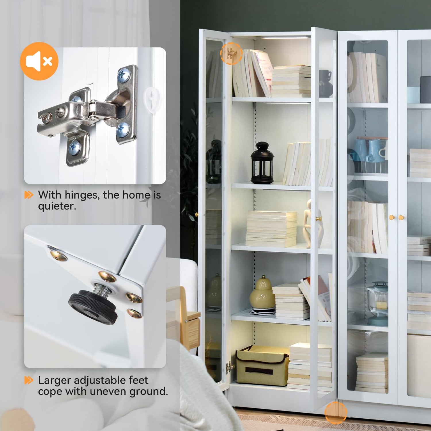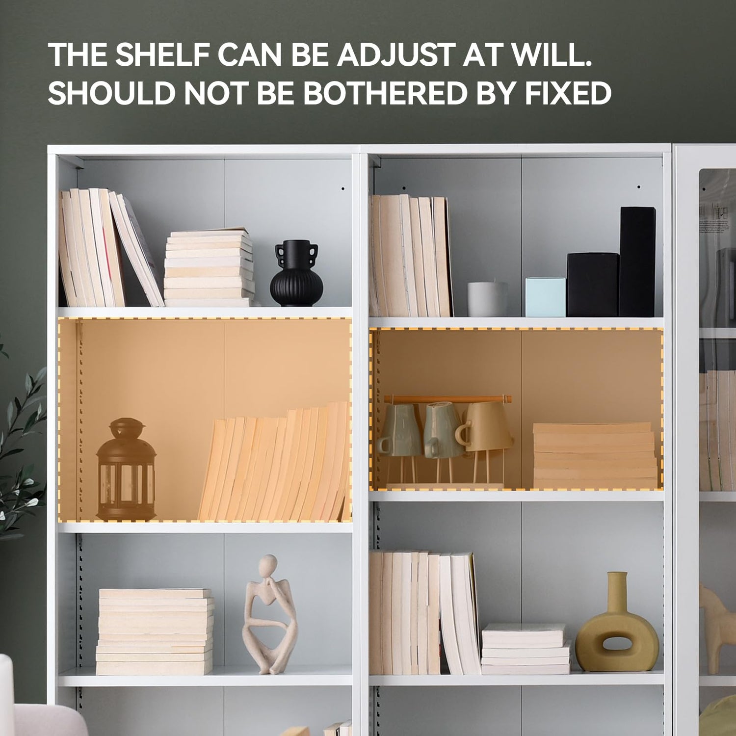 - Curio Cabinet with Adjustable Shelves for Books & Curio Display: White Bookshelf with glass doors is equipped with 4 flexible shelves (1cm minimum adjustment) + 1 fixed shelf, which cab be used as book case with doors(hardcover books/A4 files) or metal cabinet with glass doors and shelves for decorative display. Each shelf holds 180 lbs, supporting heavy books, small printers, or curated curio collections for living rooms, home offices, or commercial spaces (vitrinas de vidrio para negocio)