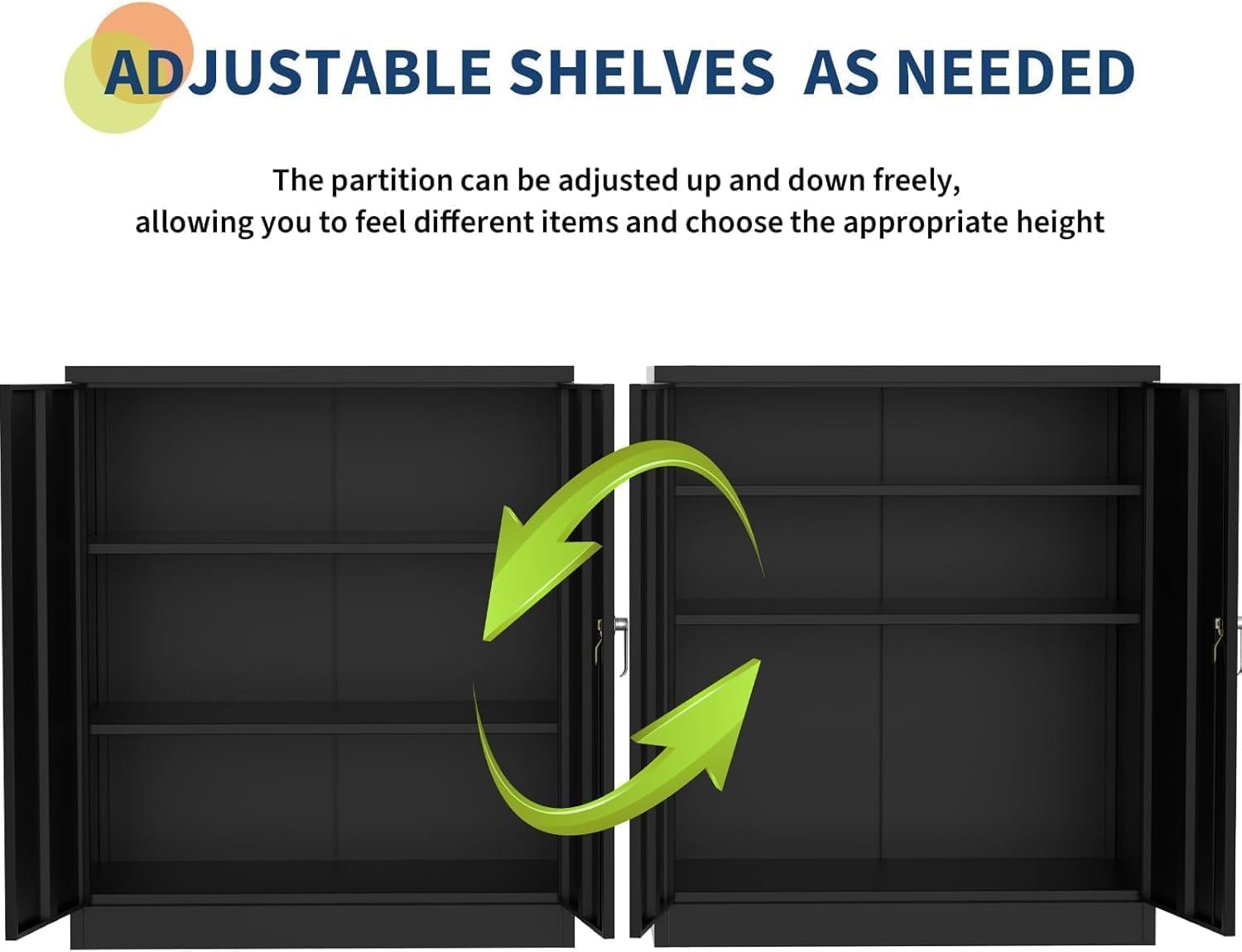 Features two height-adjustable shelves, allowing you to customize the interior for tall tools, binders, gallon cleaners, bins, and other bulk items. Maximize vertical space and keep essentials organized and accessible. Lockable Double Doors for Security:
