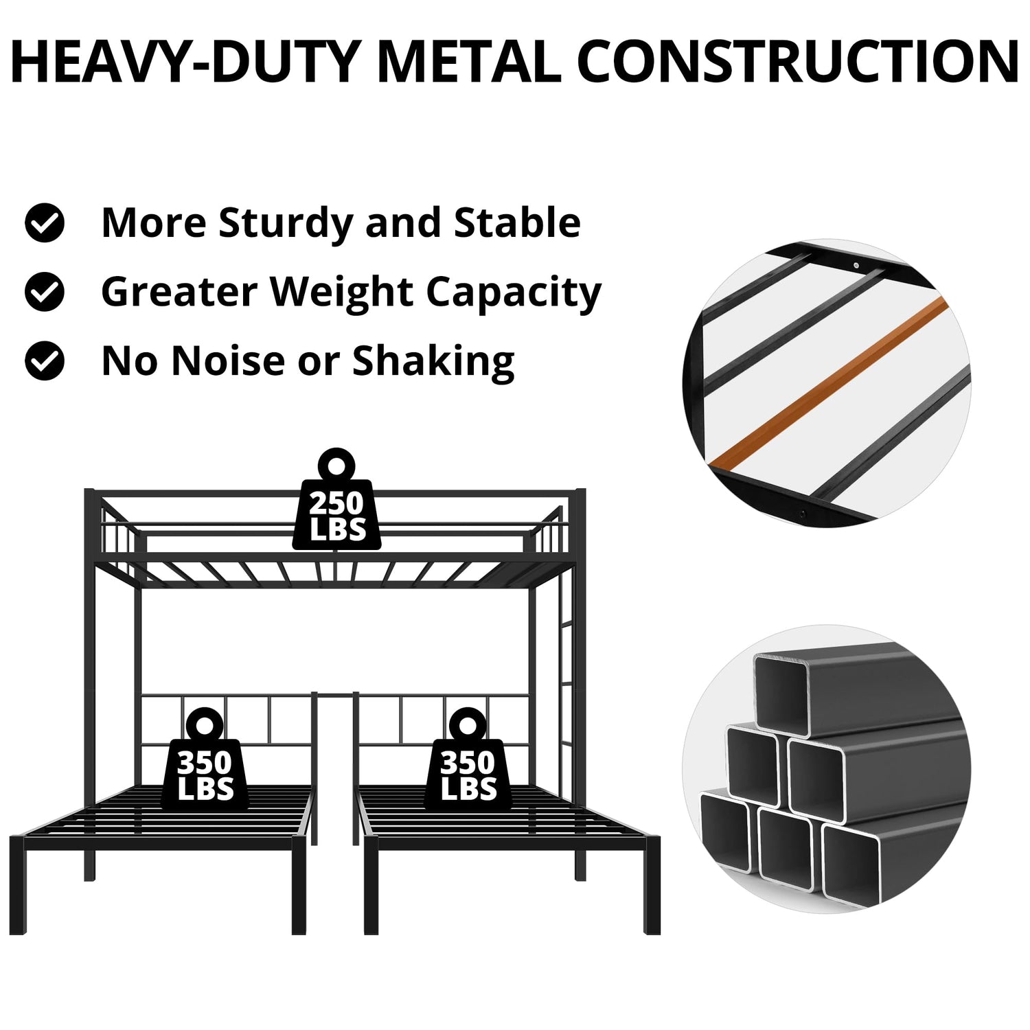 - [Premium Steel Frame] Our bunk beds are constructed with quality-tested metal construction for solid support. Heavy-duty steel slats are naturally bonded to the bed frame, providing greater stability and preventing the mattress from sagging. The upper/lower bed weight capacity is: 250lbs/350lbs respectively.