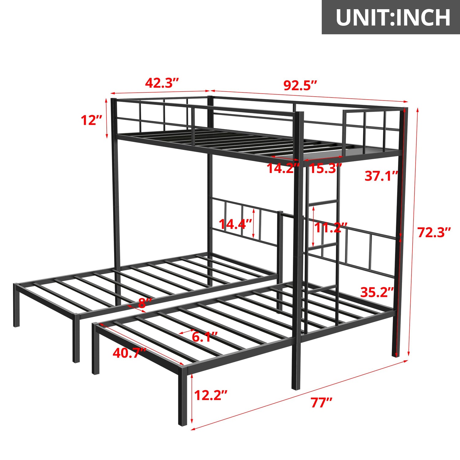 Recommended Mattress Thickness:6” for upper bed, 8” for bottom beds.
