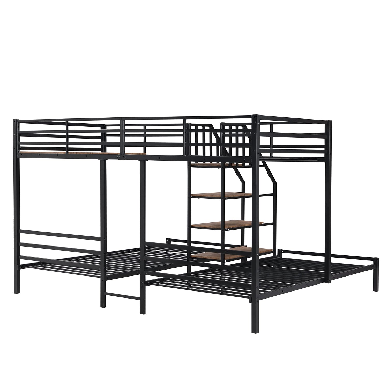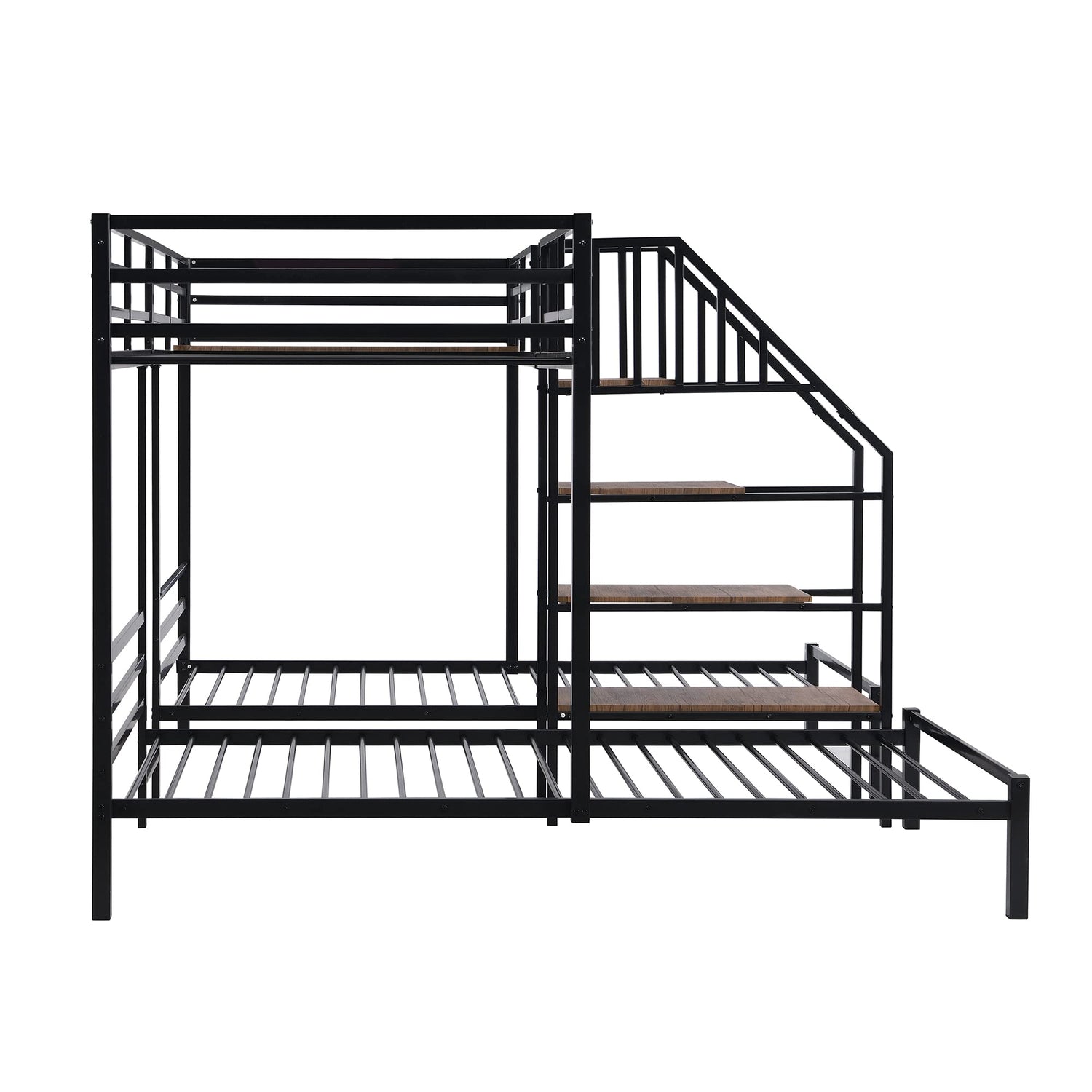Metal Triple Bunk Bed with Storage Shelves Staircase, Twin Over Twin & Twin Bunk Bed with Safety Guardrail for Kids Teens Adults Bedroom and Dormitory. (Black#P)