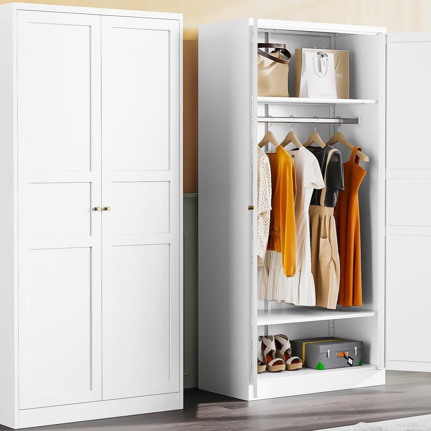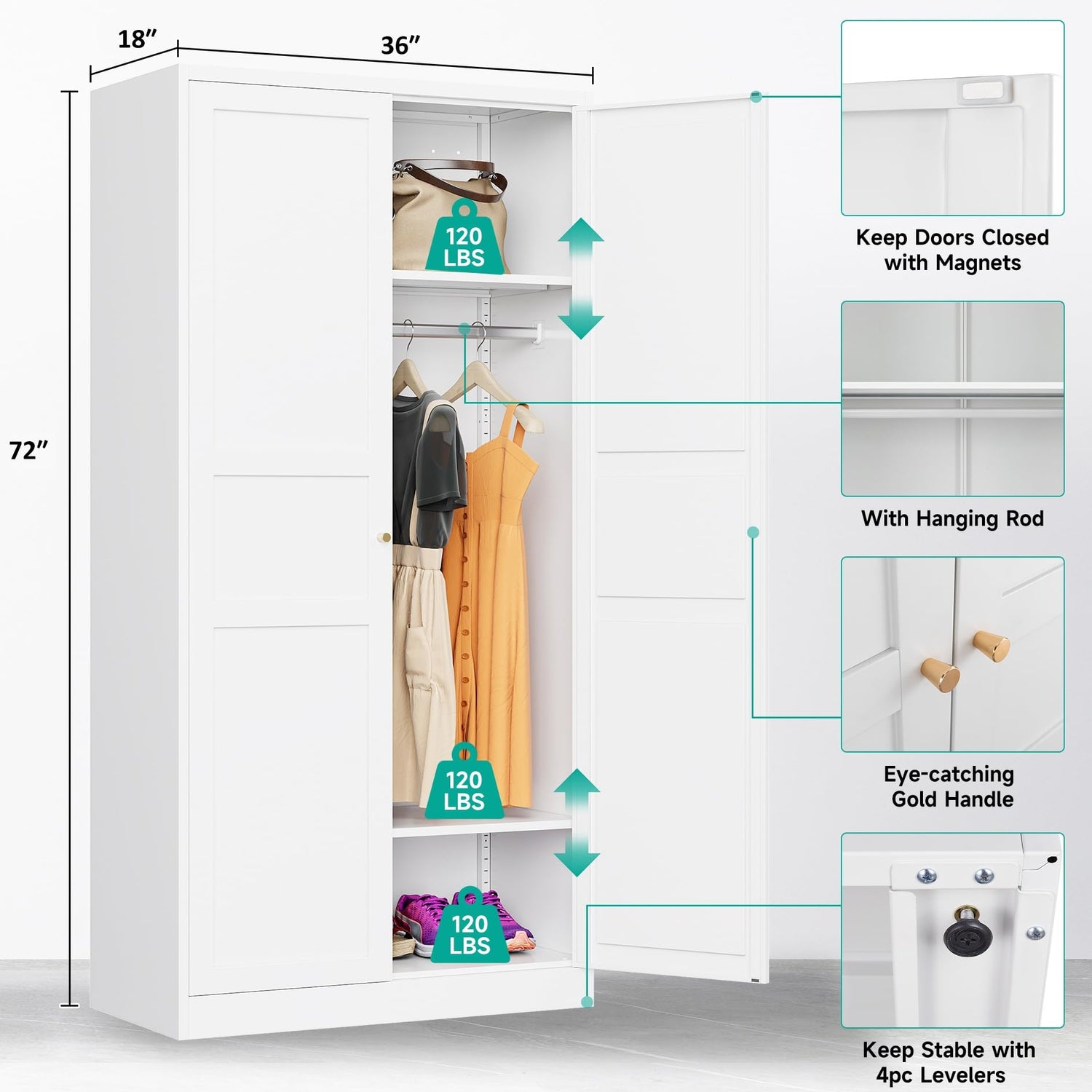 Metal Wardrobe Cabinet with Hanging Rod,White Armoire Wardrobe Closet,Metal Clothing Storage Cabinet with Adjustable Shelves and Doors,72" Wardrobe Storage Cabinet for Home,Living/Laundry Room