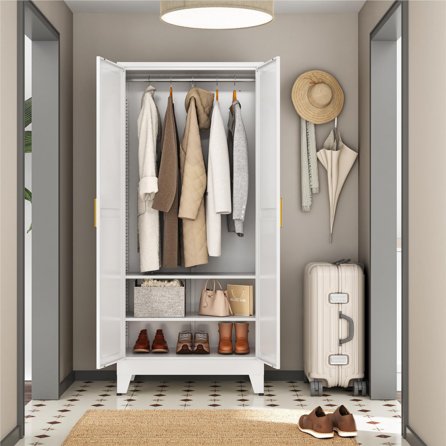 Metal Wardrobe Closet with Doors and Shelves, 71" Farmhouse Bedroom Armoire with Hanger Rod and Clothing Shelf, White Steel Wardrobe Cabinet Storage Clothes Closet