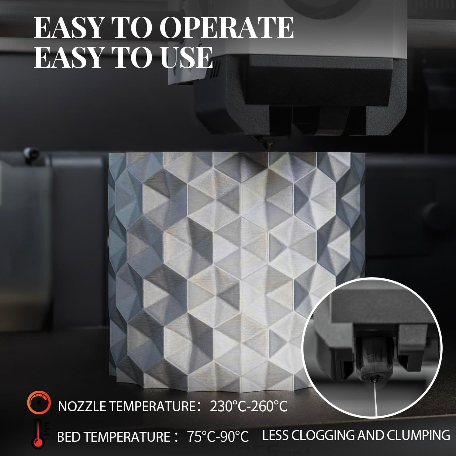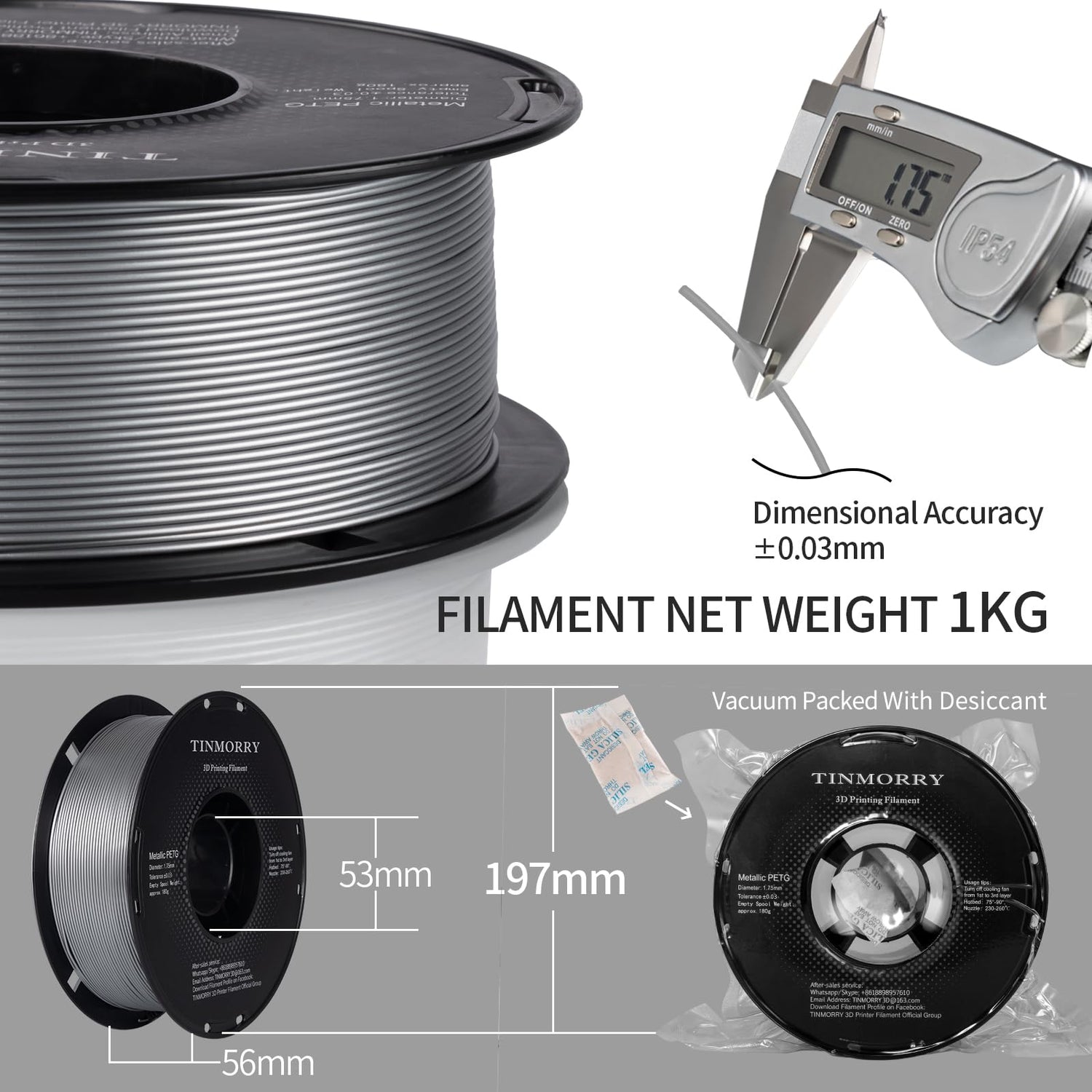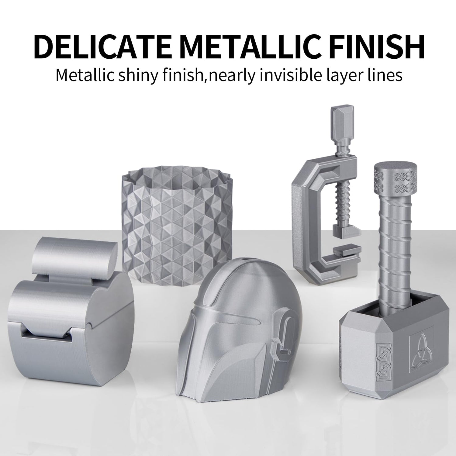 - 【Metallic Silver PETG Filament】This Metallic Silver PETG filament has a high-grade metallic luster while maintaining almost the same comprehensive performance as ordinary PETG, bringing a high-grade and exquisite smooth metal surface to 3D projects. No metal particle filling. No post-polishing is required, and you can immediately get printed works with a metallic texture. It is suitable for printing various decorations and creative products that require high appearance requirements.