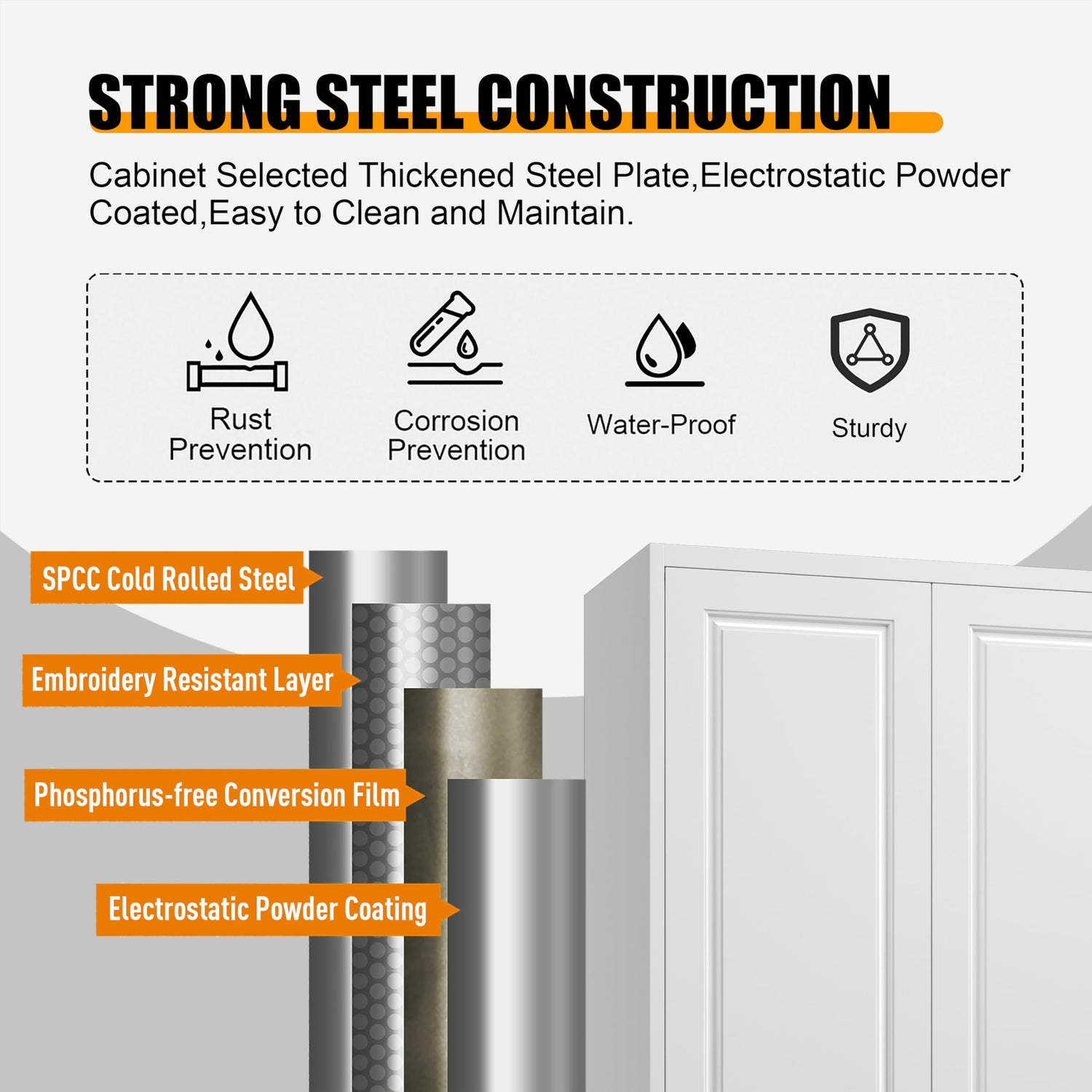 - Metal Cabinet: Kitchen pantry cabinet is made of cold-rolled steel plate, with a powder coating process to prevent rusting. Sturdy, easy to clean surfaces. White large cupboards come with an anti-tip feature that prevents the kitchen cabinets from tilting and protects your family