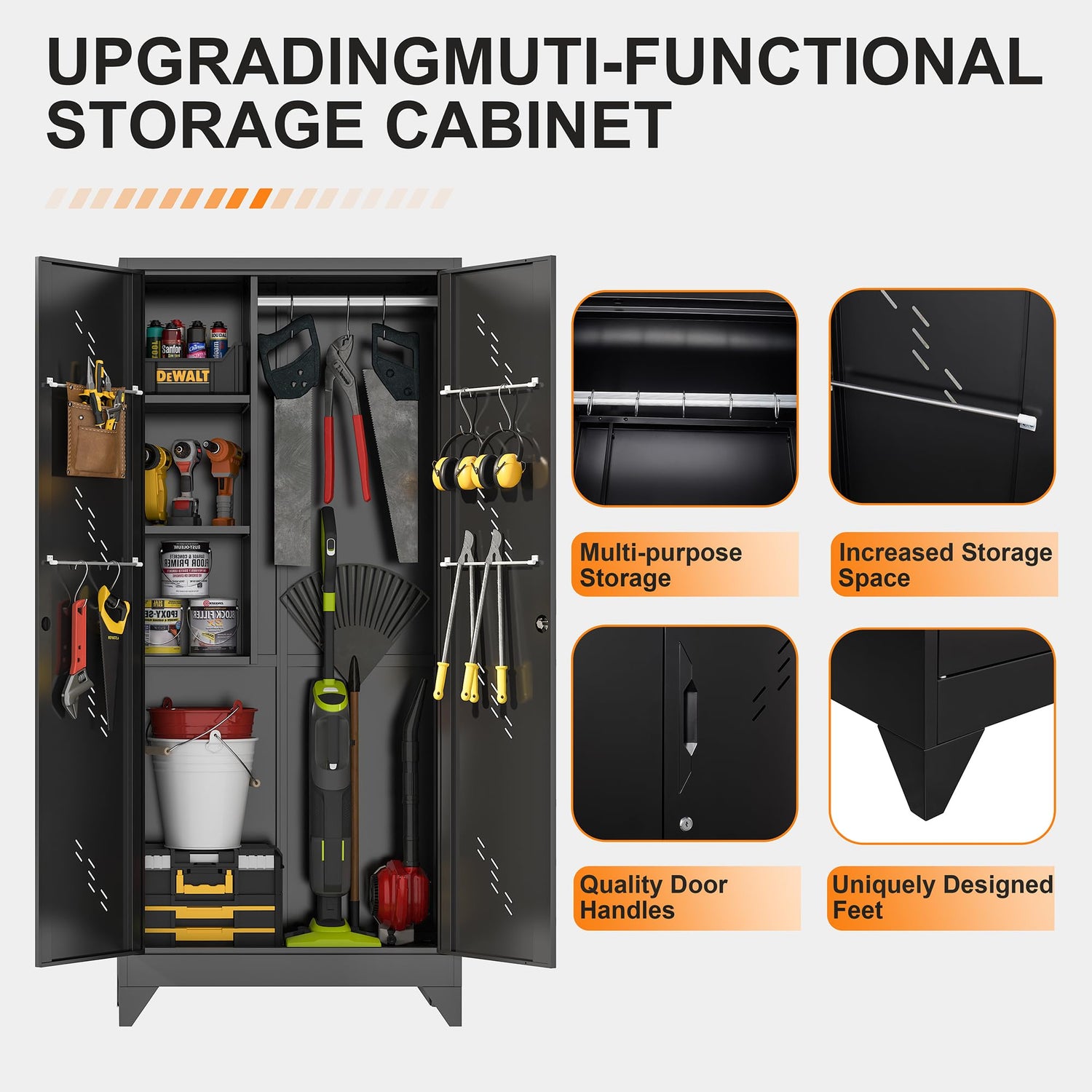 - 【Sturdy and Durable】The garage tool cabinet is made of high-quality metal, with a load-bearing capacity of 150 pounds per layer without deformation. You can use it to store various tools such as brooms, mops, brushes, sweepers, lawnmowers, and skis