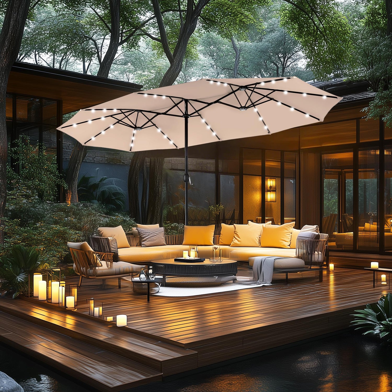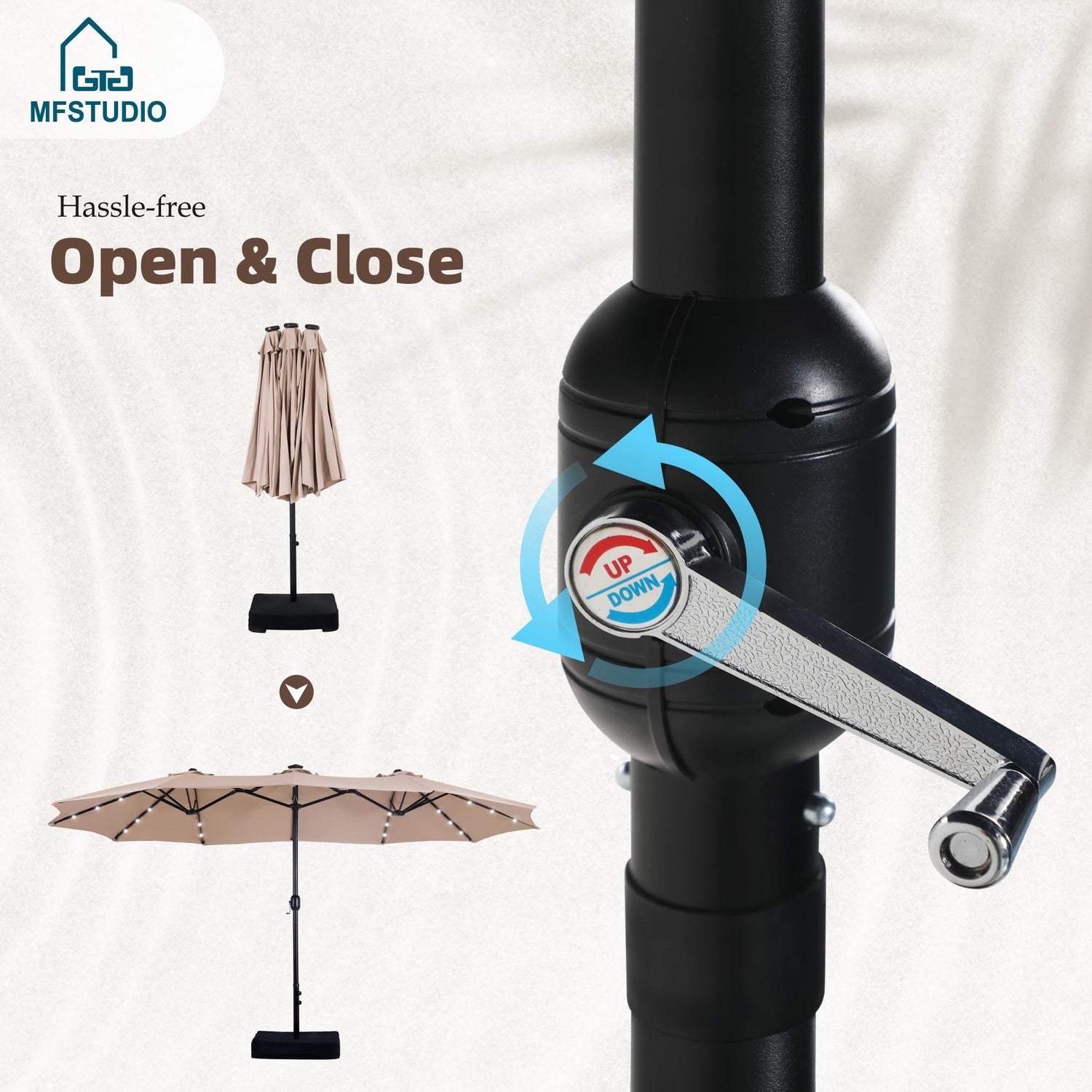 MFSTUDIO 15ft Double Sided Patio Umbrella with Solar Lights, Outdoor Large Umbrellas with Crank Handle and 36 LED Lights, Rectangular Market Umbrella with Base Included for Deck Pool Shade, Beige