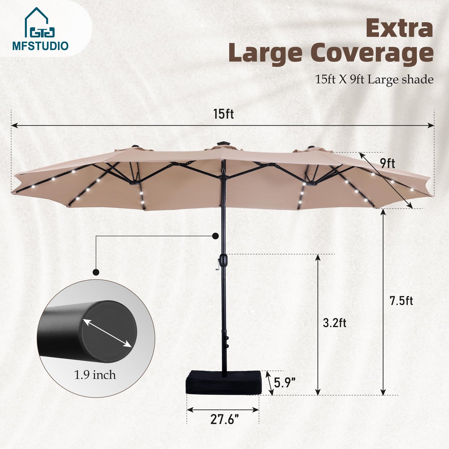 - Large Shading with Double Sided: This patio umbrella measures 15 x 9 x 8 ft(L x W x H), providing a large shading area of 135 sq. Ft for your outdoor activities, enjoy more comfort and coolness
