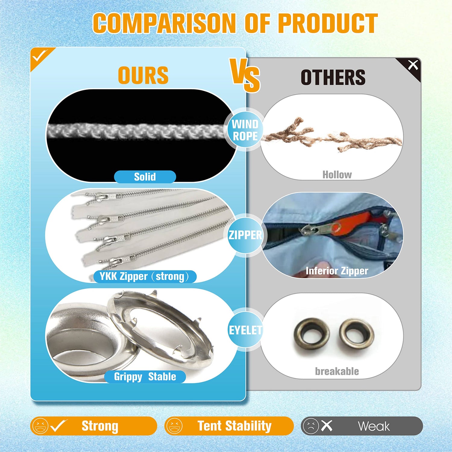 - Heavy Duty Party Tent:The outdoor party tent made of heavy-duty thickened 38mm upgraded galvanized steel tubing for the frame, with a powder-coated surface for rust and corrosion resistance, and durability in rain and wind to ensure a long carpa para fiestas life and safety, and we free provide enhanced accessories such as grippy hooks, high-quality zipper,pegs, and strong wind ropes to secure the party canopy's stability and wind-resistant.
