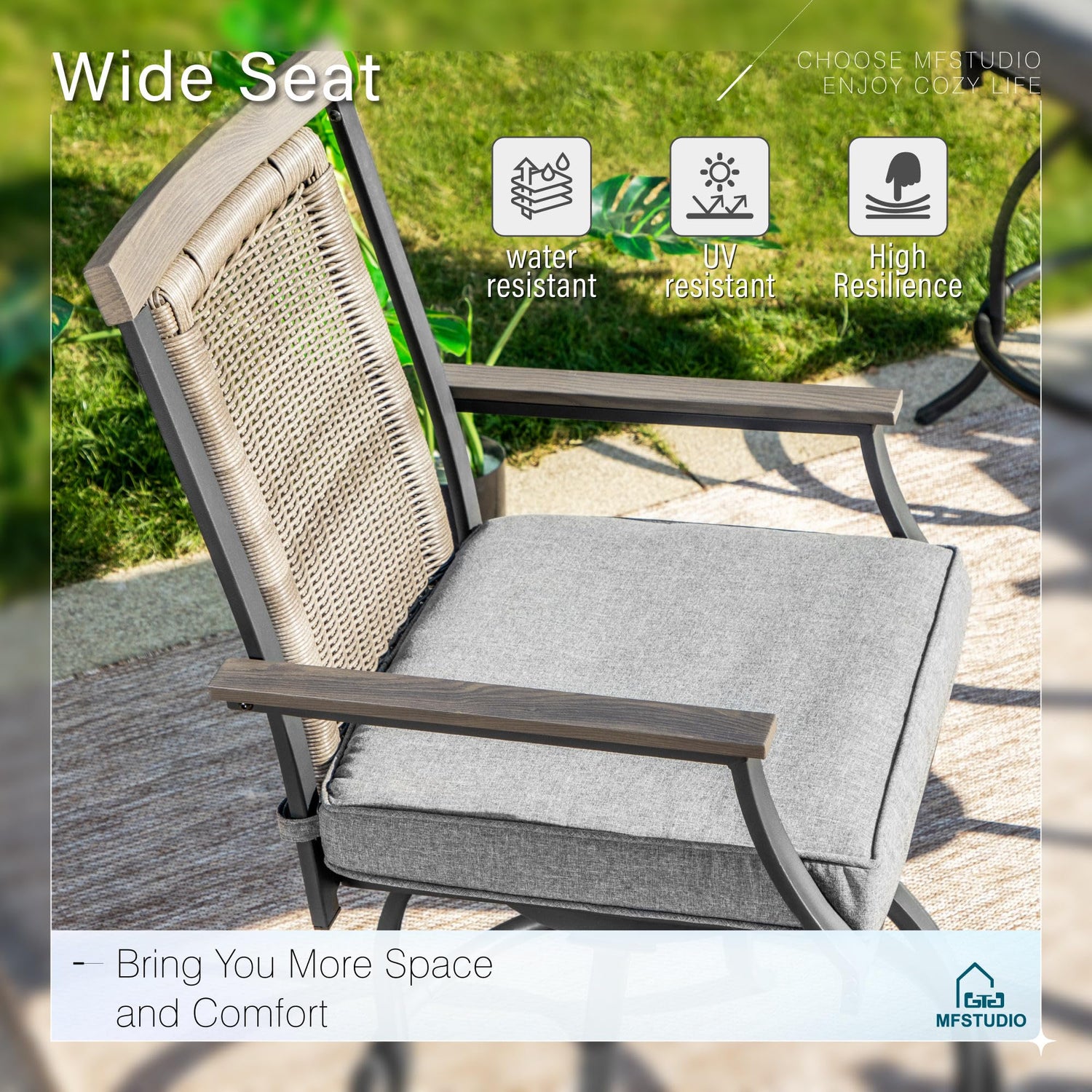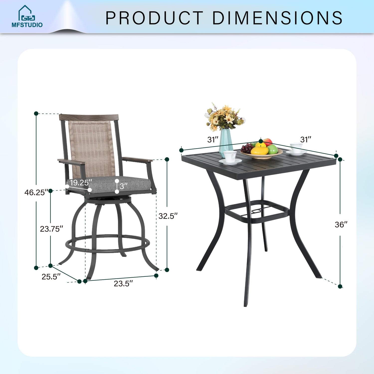 MFSTUDIO 3-Piece Outdoor Bar Set with 2 Swivel Wicker Rattan Cushion Chairs and 1 Metal Table, Perfect Patio Counter Height Table and Chairs