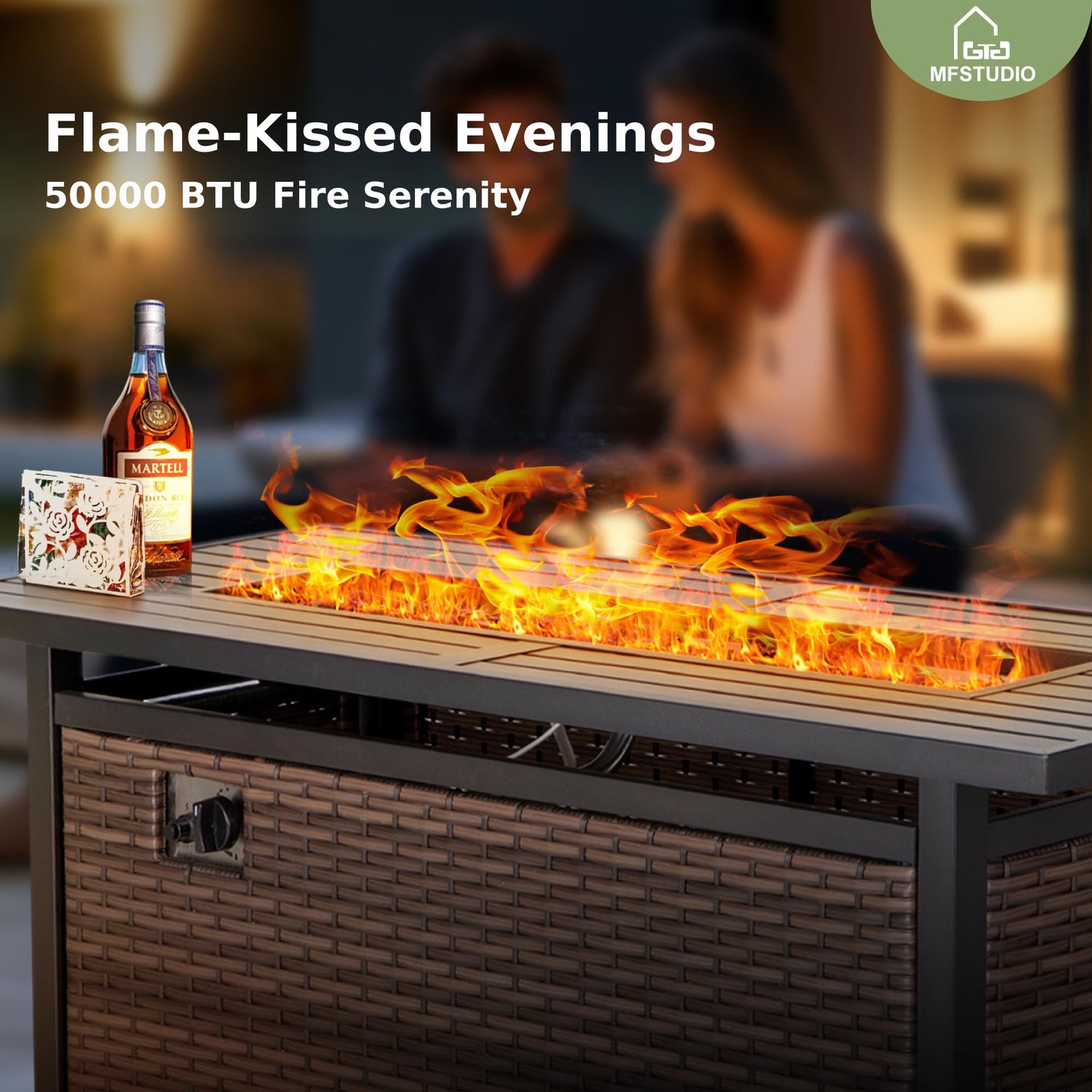 - Extra Lage Fire Pit Table: 56" rectangular propane gas fire pit table is 50,000 BTU heat output, providing a warm & romantic bonfire atmosphere. Conforming to the CSA certification requirements, this product has been issued a CSA certificate. The frame of this patio fire pit table is made of powder-coated iron, which is sturdy and heat resistant.