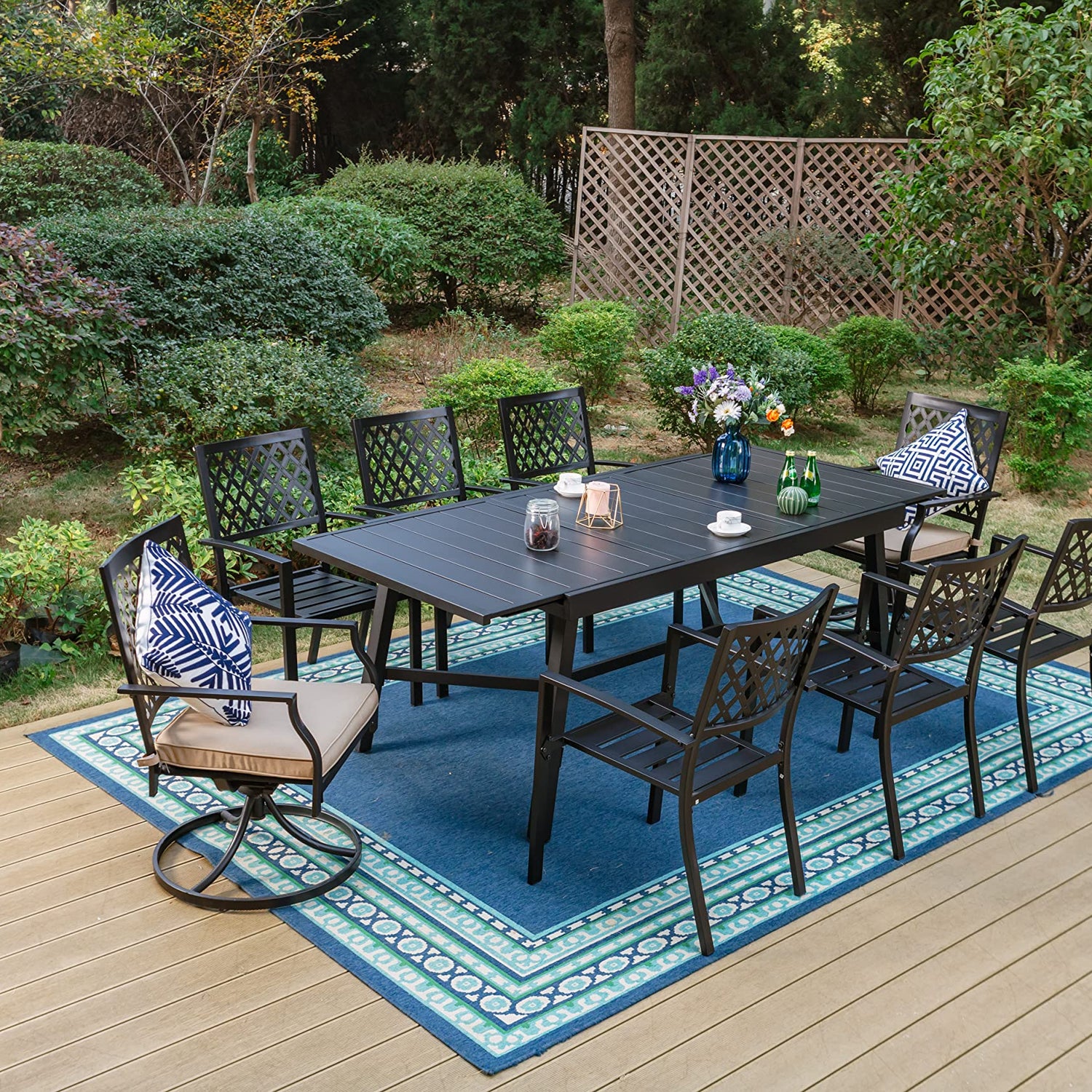 - 9 Piece Dining Set: Includes 1 rectangle extendable dining table and 8 Metal Chairs, including 6 Fixed and 2 Swivel Chair with Removable Cushions, meets all of your outdoor or indoor furniture needs, adding style to your space without sacrificing comfort.
