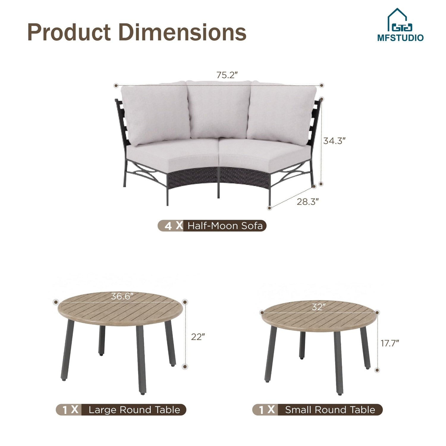 MFSTUDIO Patio Furniture Set, 8 Seats Half-Moon Curved Outdoor Sectional Sofa Conversation Set, Woven Rattan Patio Couch with 2 Wood-Like Round Coffee Table