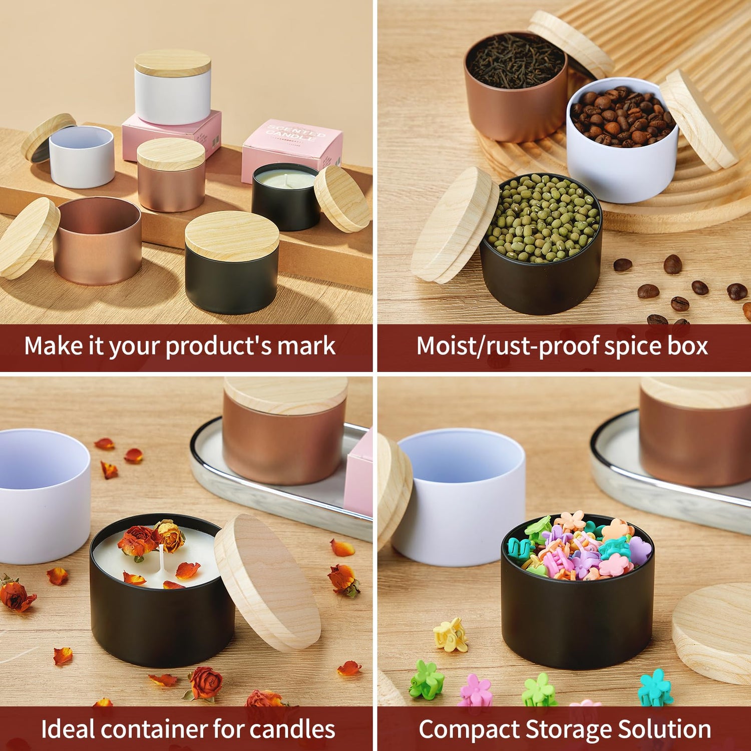 - 【High Quality Metal Candle Tins】The candle tins with lids is made of drop and impact resistant high strength metal can body, with natural wood grain sealing lid, the moisture resistance performance is increased by 40%, effectively resisting bumps and dents and items moisture problems. Adopt high temperature resistant lacquer process, making aromatherapy candles are not easy to deform, safe and durable.