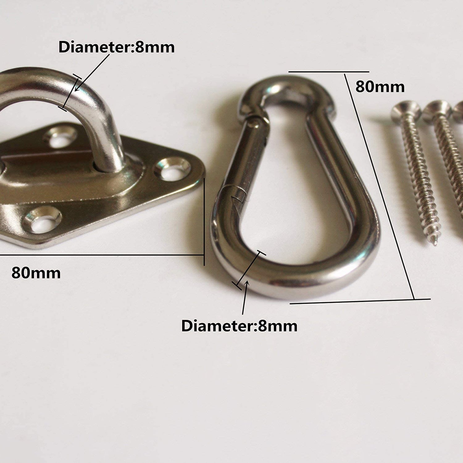 - Please don’t install the screws on the tree. Please make the screws all went into the wood, if the screws don't all went into the wood, the screws will easily broken. This Hammock Kit for hammock stand includes 2 Stainless Steel Rhombus pad, 8 Stainless screws and 2 spring snap hooks,304 Stainless Steel provide the highest quality,the Stainless screws is 50mm long.