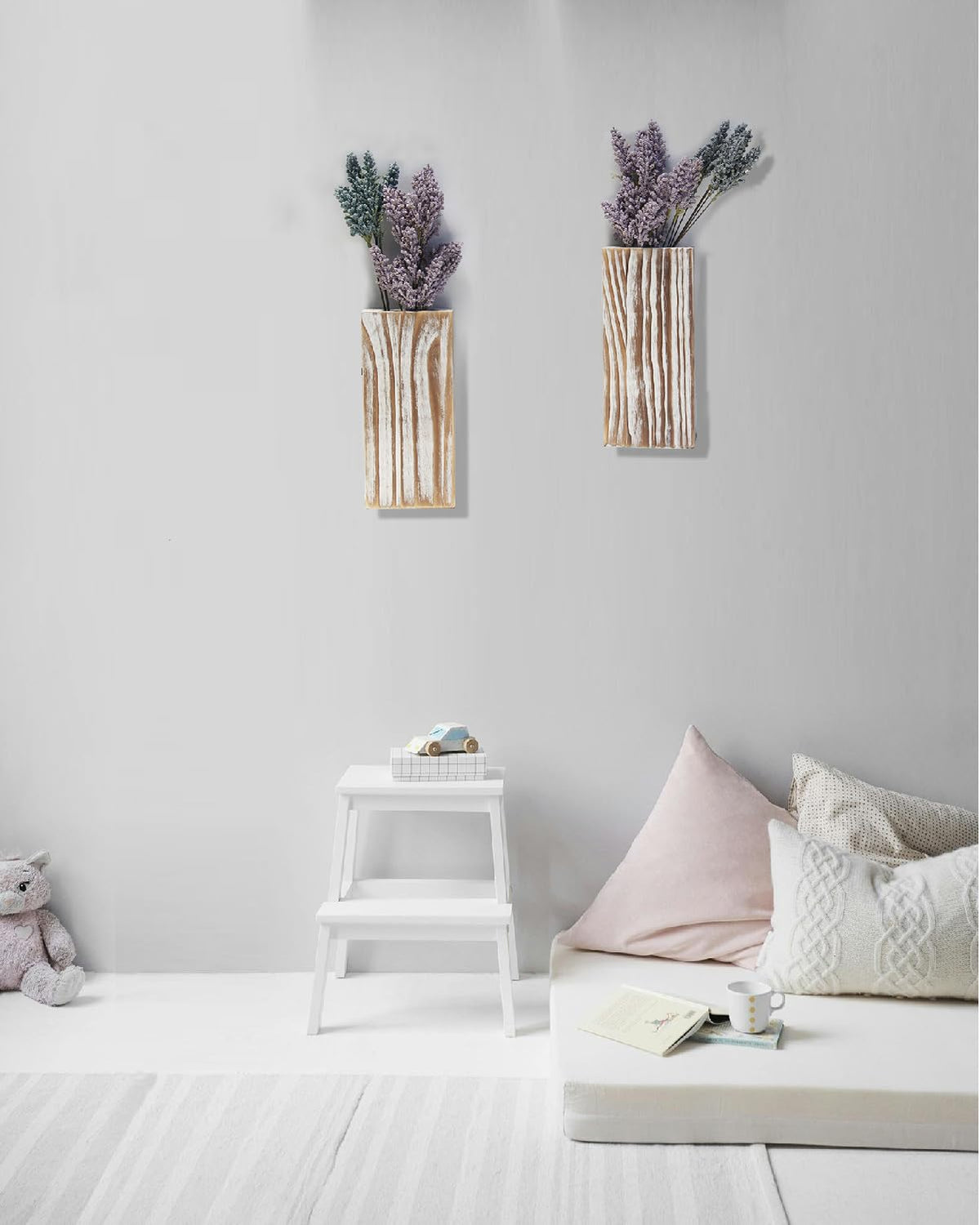 - WOOD WALL VASE:This is a 4 sided wooden wall vase. It is not meant to hold water. You can slip faux flowers or plants in the pocket, great for displaying artificial greenery plants, faux flowers, floral arrangements, seasonal decorations, shrub bouquet, foliage, fake lavender, eucalyptus plants,or cotton.