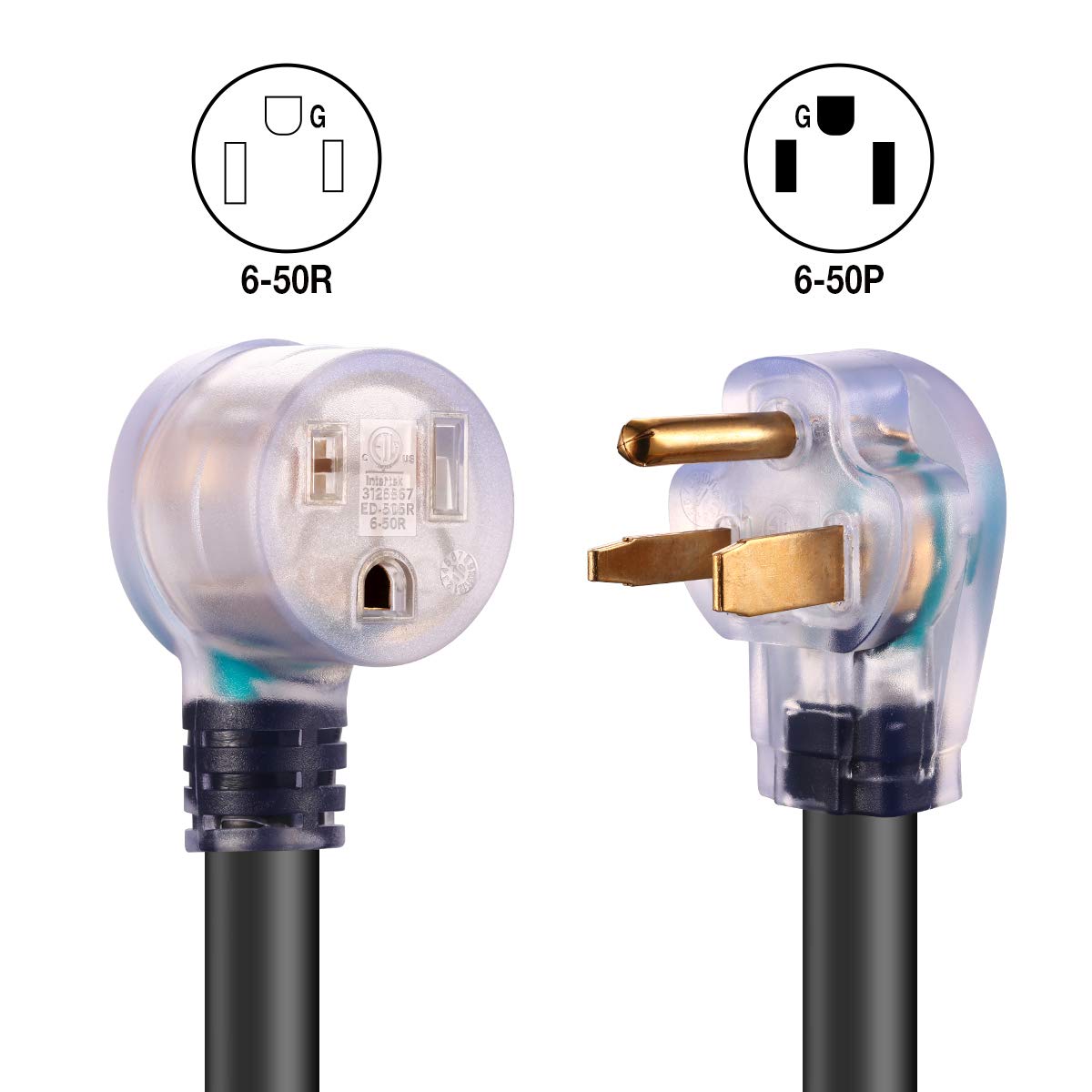 Miady 25ft 50AMP Welding Cord, 8 Gauge Heavy Duty Industrial NEMA 6-50 Welding Machine Cord with Lighted End. It features excellent abrasion, oil and moisture resistance and flexibility fits to extend the welding machine. STW jacket and 8 AWG (American wire gauge) x 3C all-copper wires with 6-50 NEMA plug and connector perfect for heavy-duty performance. The clear lighted end receptacles provide a power indicator, which shows power is on and cord is ready to use, for you provide optimum performance and added safety. And it provides length enough, allows you to move your welder around the shop and close to your welding work piece for added convenience.